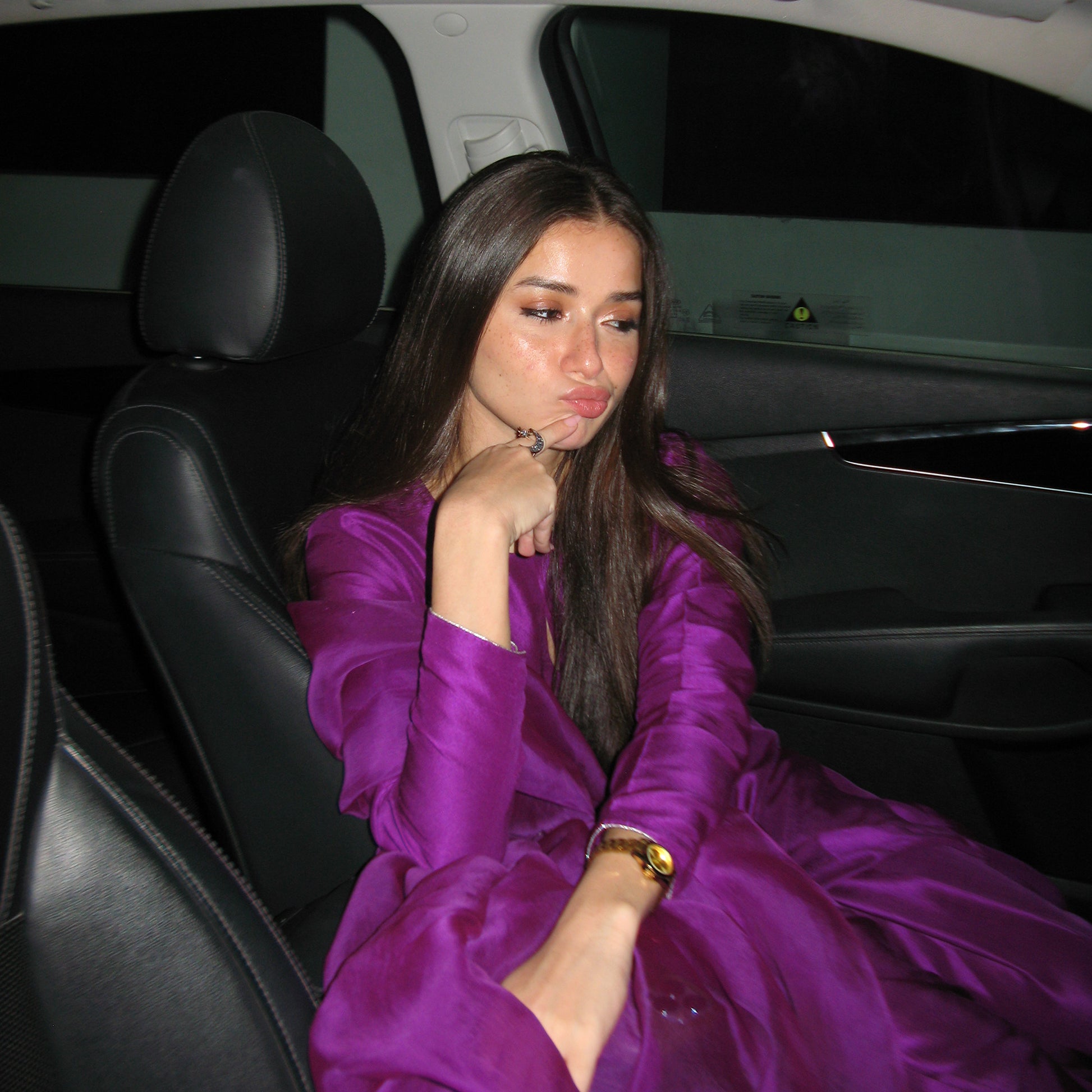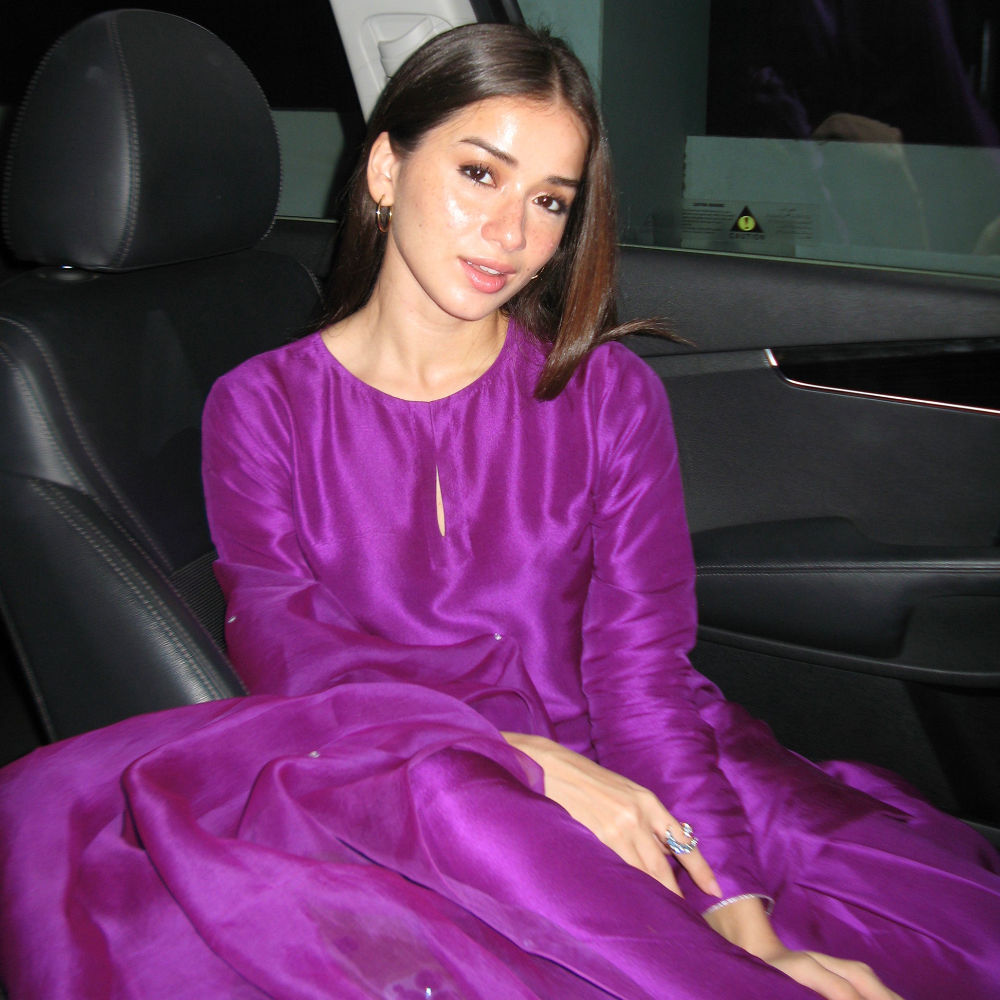 This rich purple ensemble features a cropped raw silk shirt paired with an exaggerated Farshi Shalwar, cut with commanding volume and floor-sweeping drama. The Farshi is tailored with deep inner pleats that begin high at the waist, A matching organza dupatta rests over the shoulders, offering light structure.