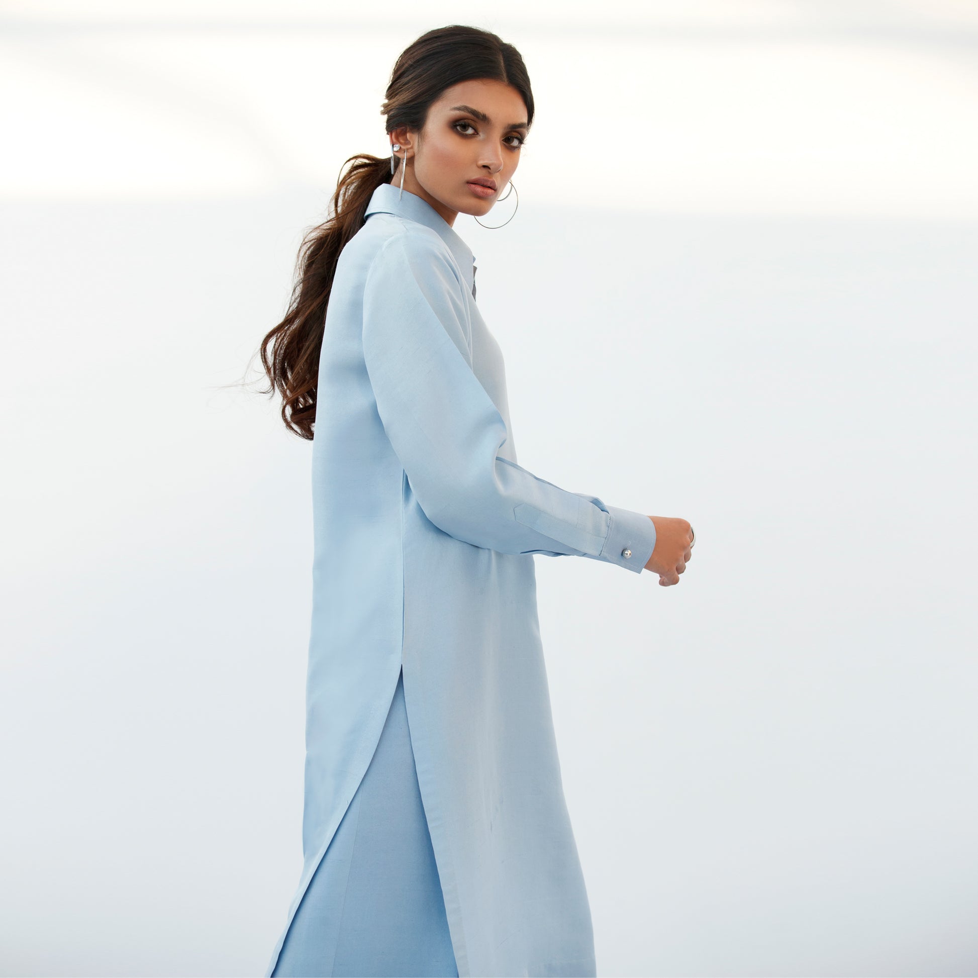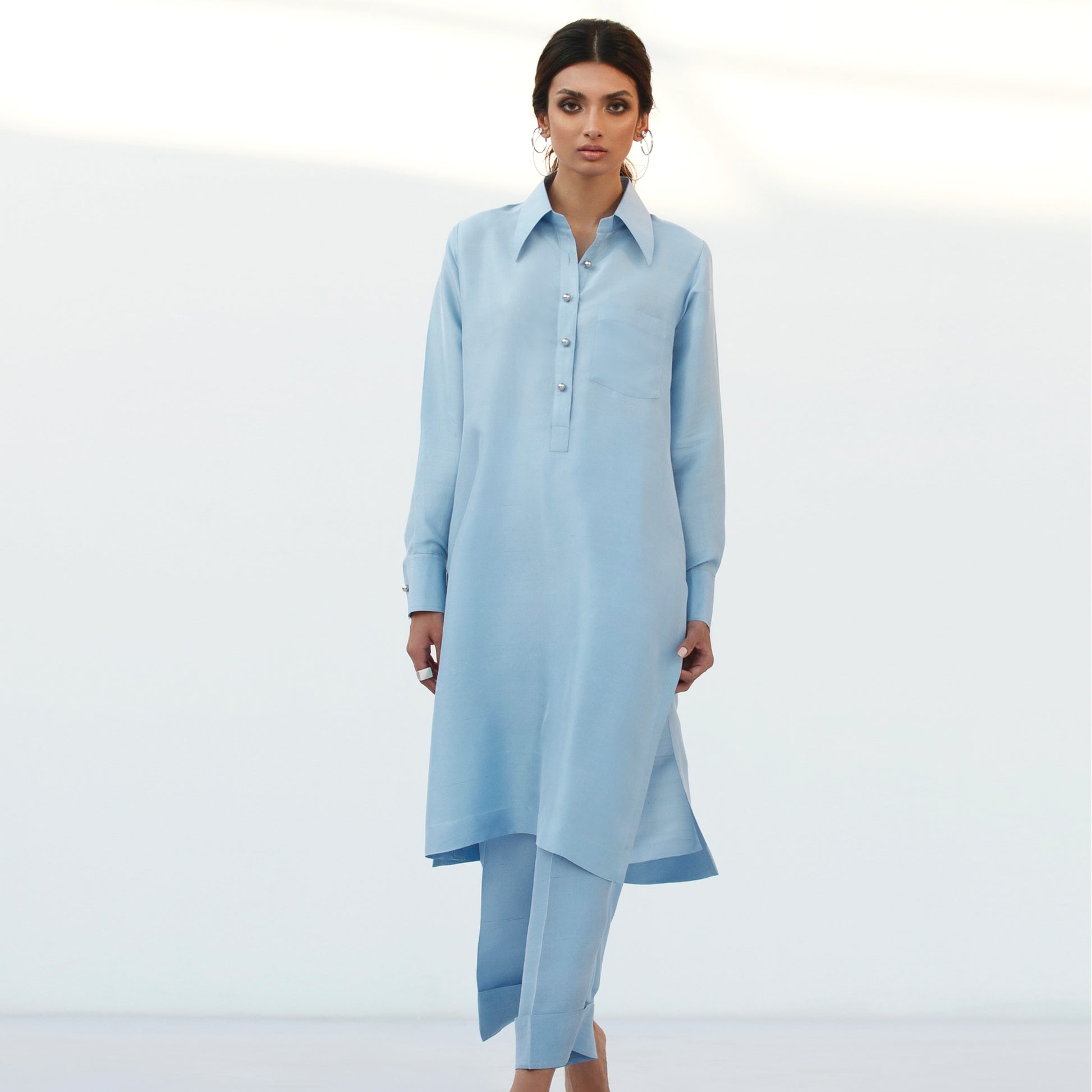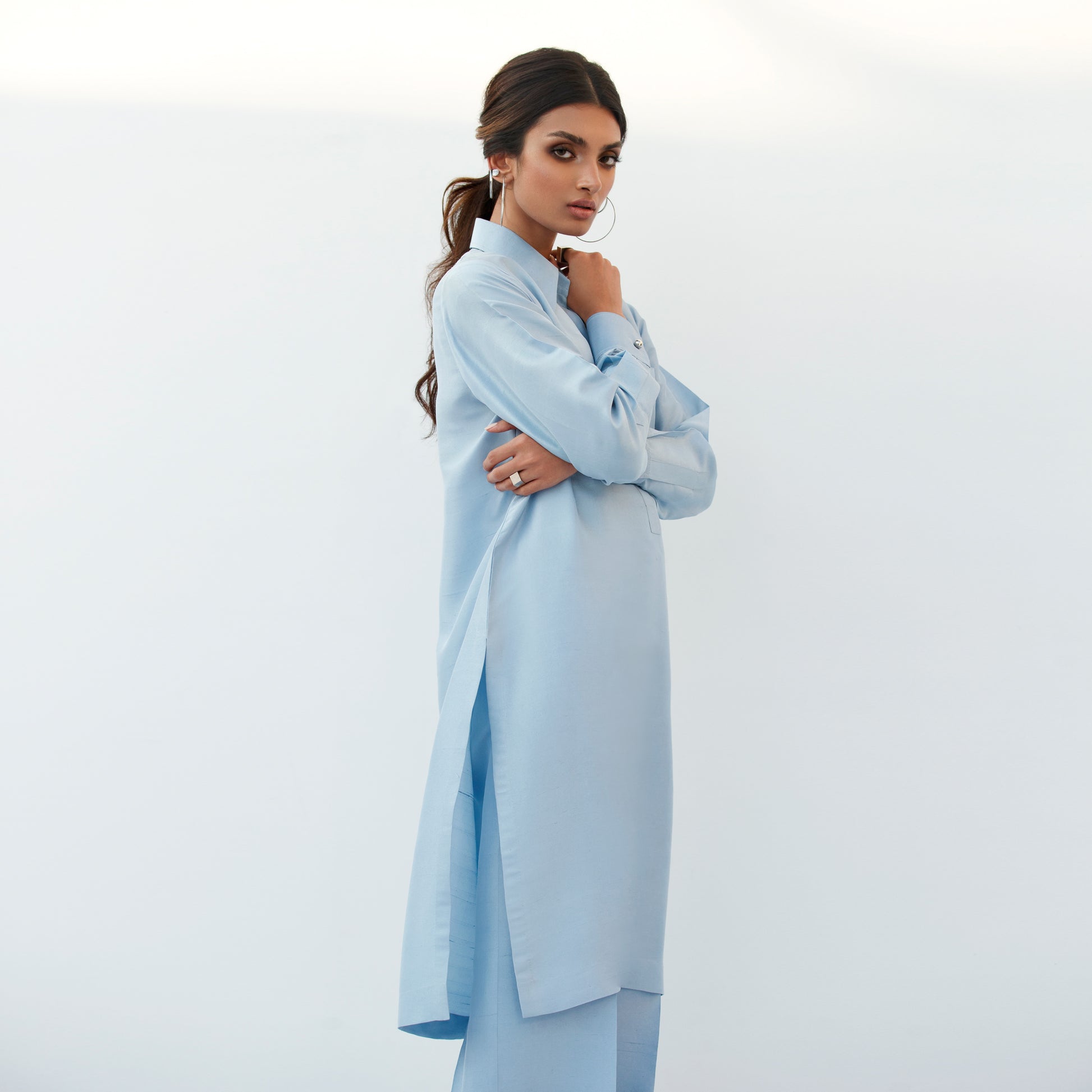In a precise shade of Arctic blue, this Shirt redefines formality with intent. The swallow-tailed collar adds an architectural edge to the clean, elongated cut. Paired with matching Cropped Wide Pants finished with structured hems, each element is measured and intentional. Complete the look with an optional organza dupatta sharp, tonal, and unapologetically composed.