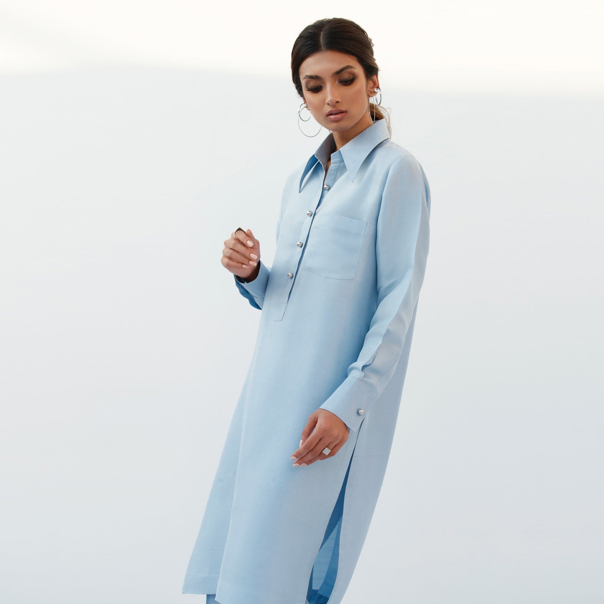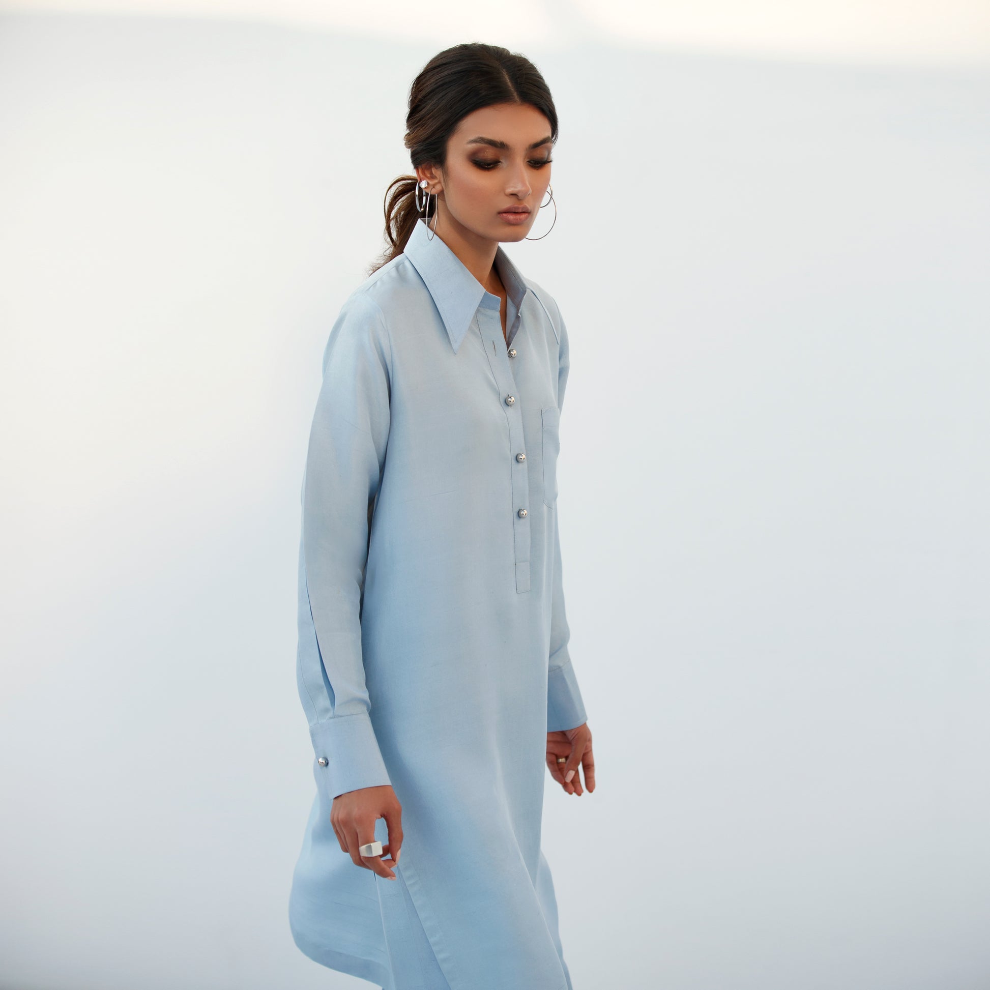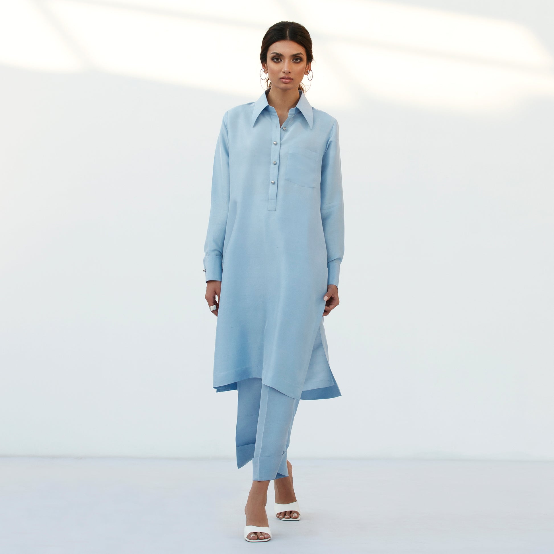 In a precise shade of Arctic blue, this Shirt redefines formality with intent. The swallow-tailed collar adds an architectural edge to the clean, elongated cut. Paired with matching Cropped Wide Pants finished with structured hems, each element is measured and intentional. Complete the look with an optional organza dupatta sharp, tonal, and unapologetically composed.