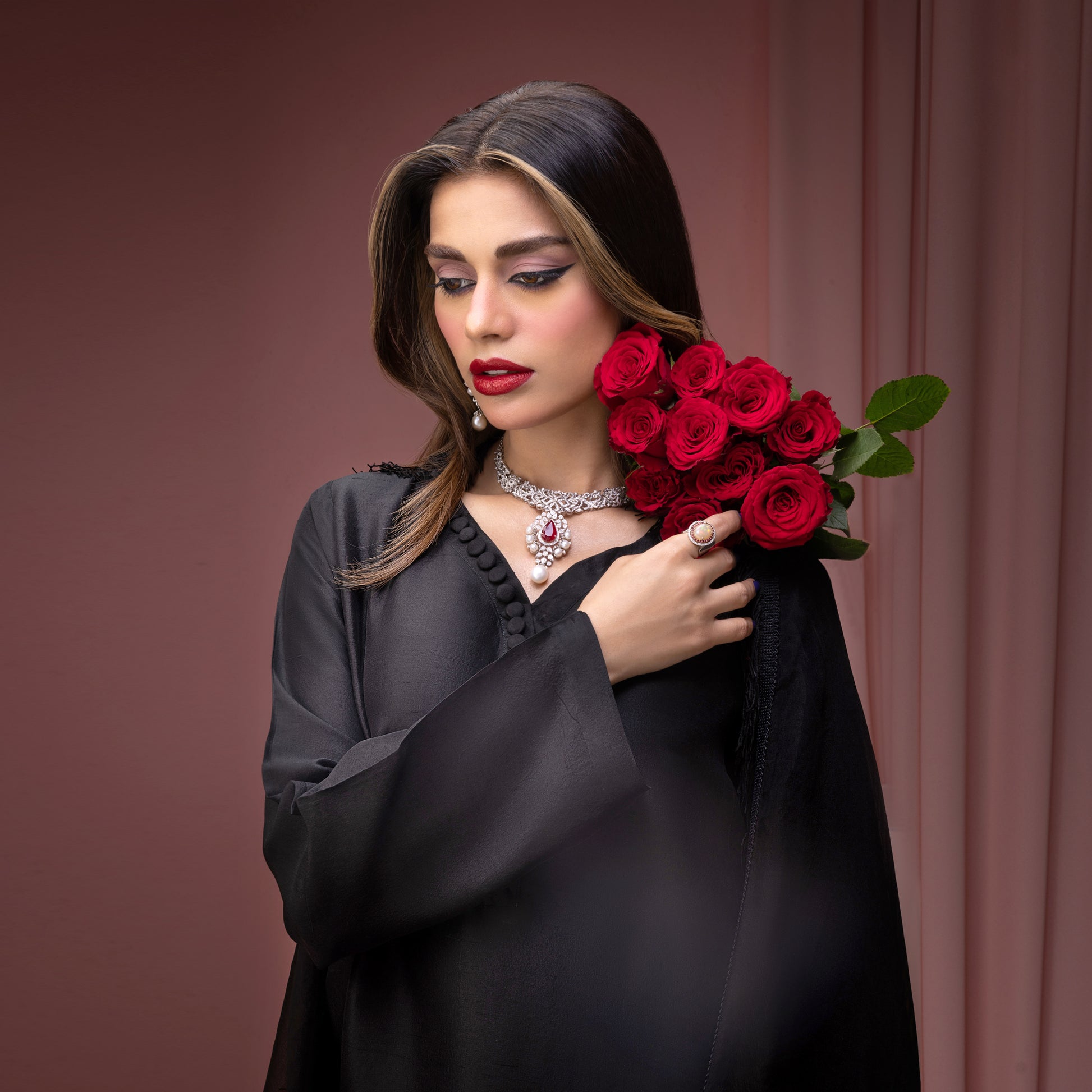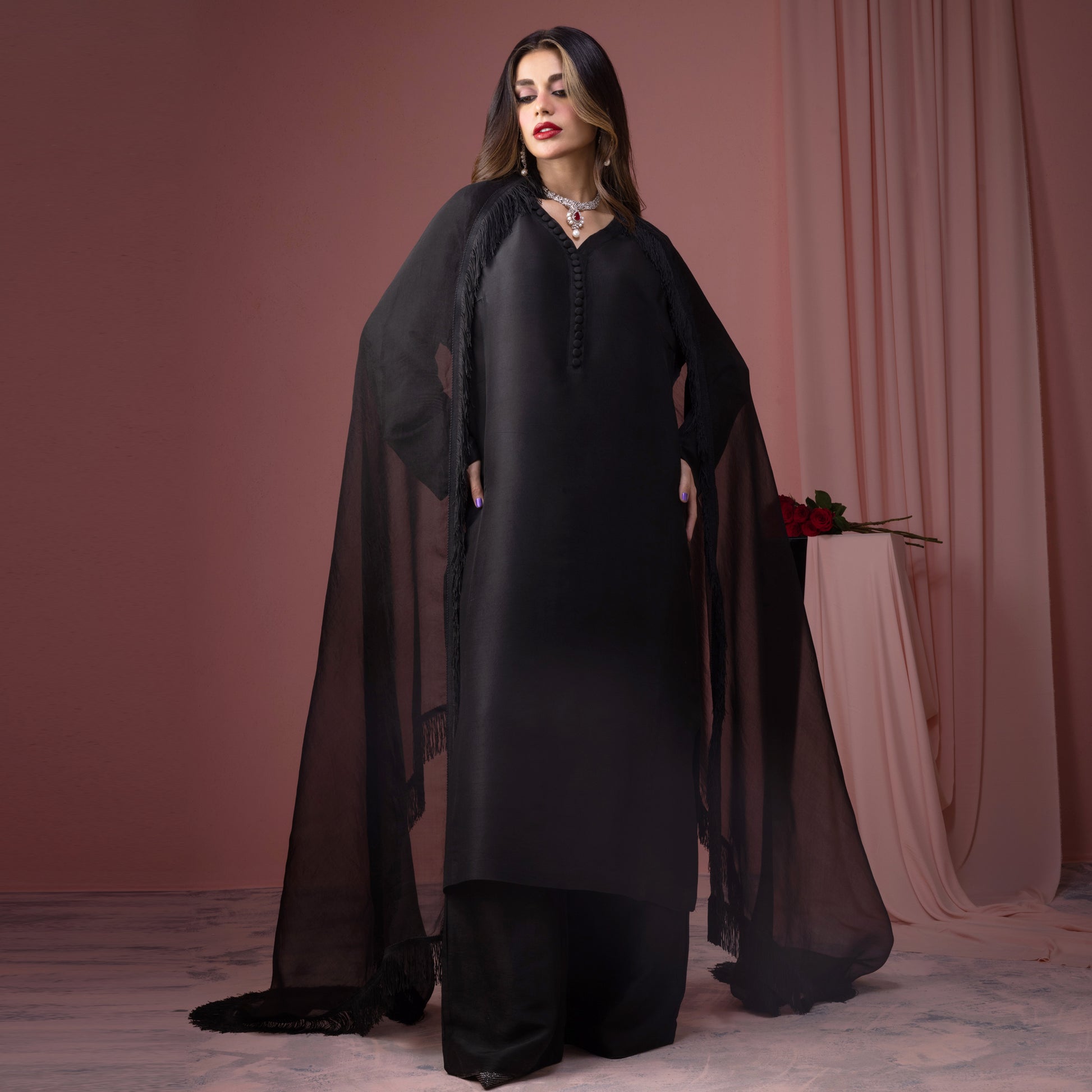 Crafted from pure raw silk, this all-black ensemble is built on structure and intent. The long, straight shirt and wide-leg trousers offer fluid movement with a grounded presence. A flowing organza dupatta, edged with delicate fringe lace, adds textural depth without distraction. An ideal choice for those who favour modest dressing.
