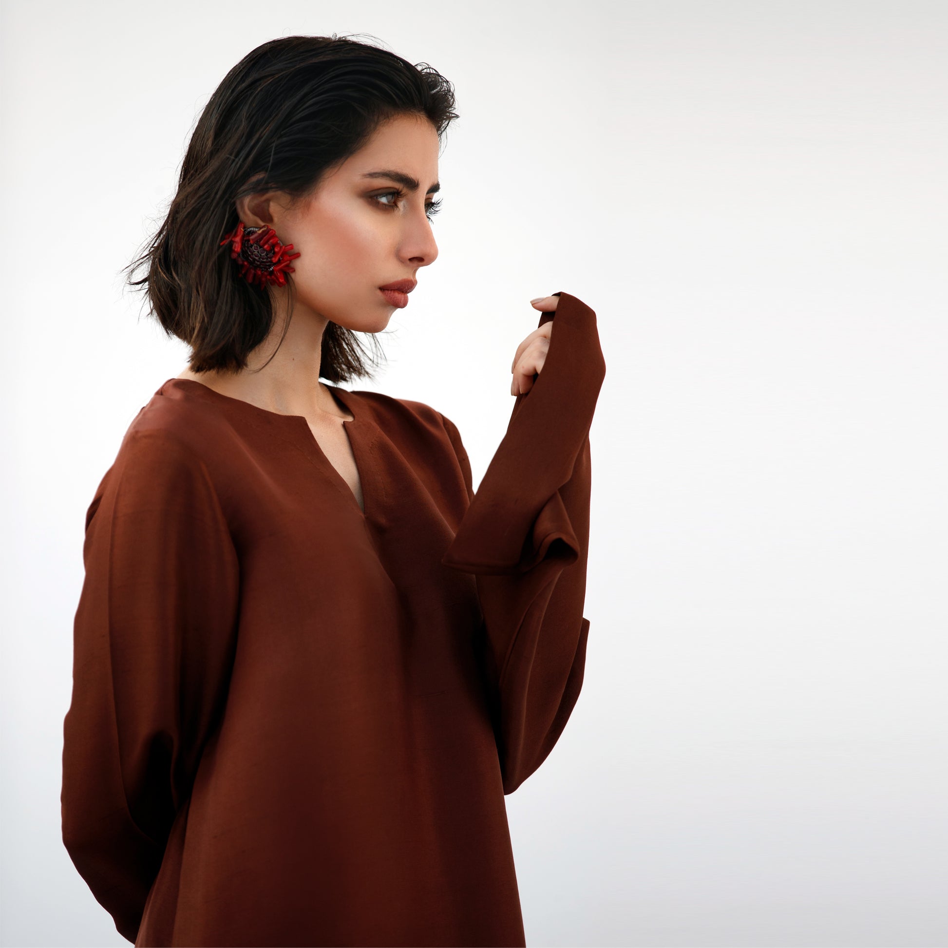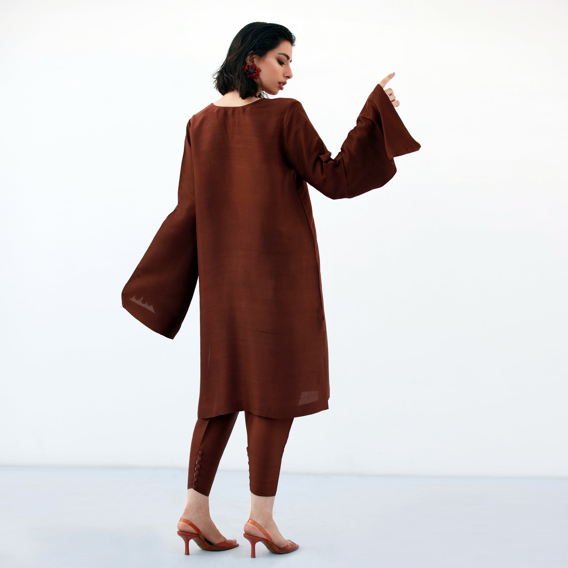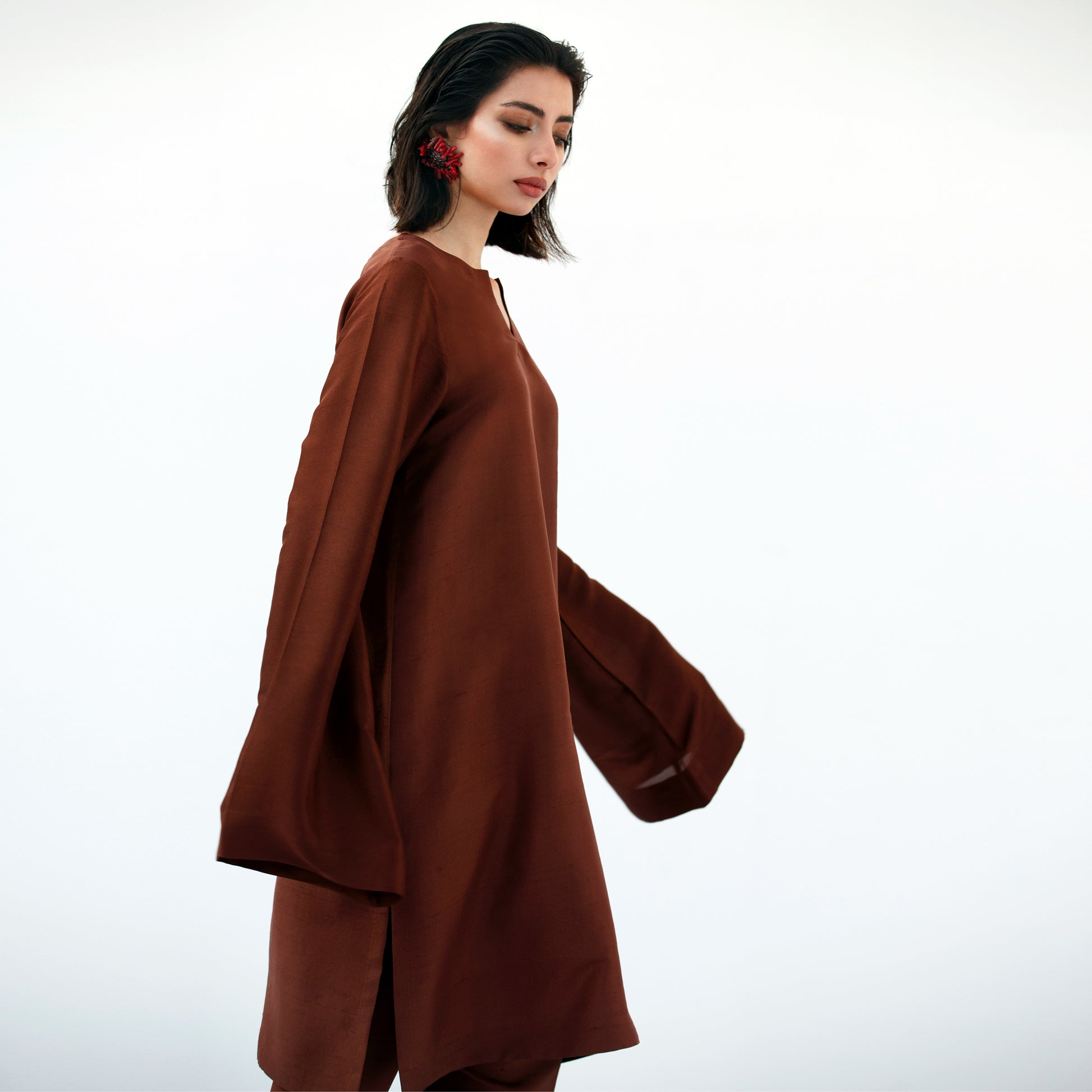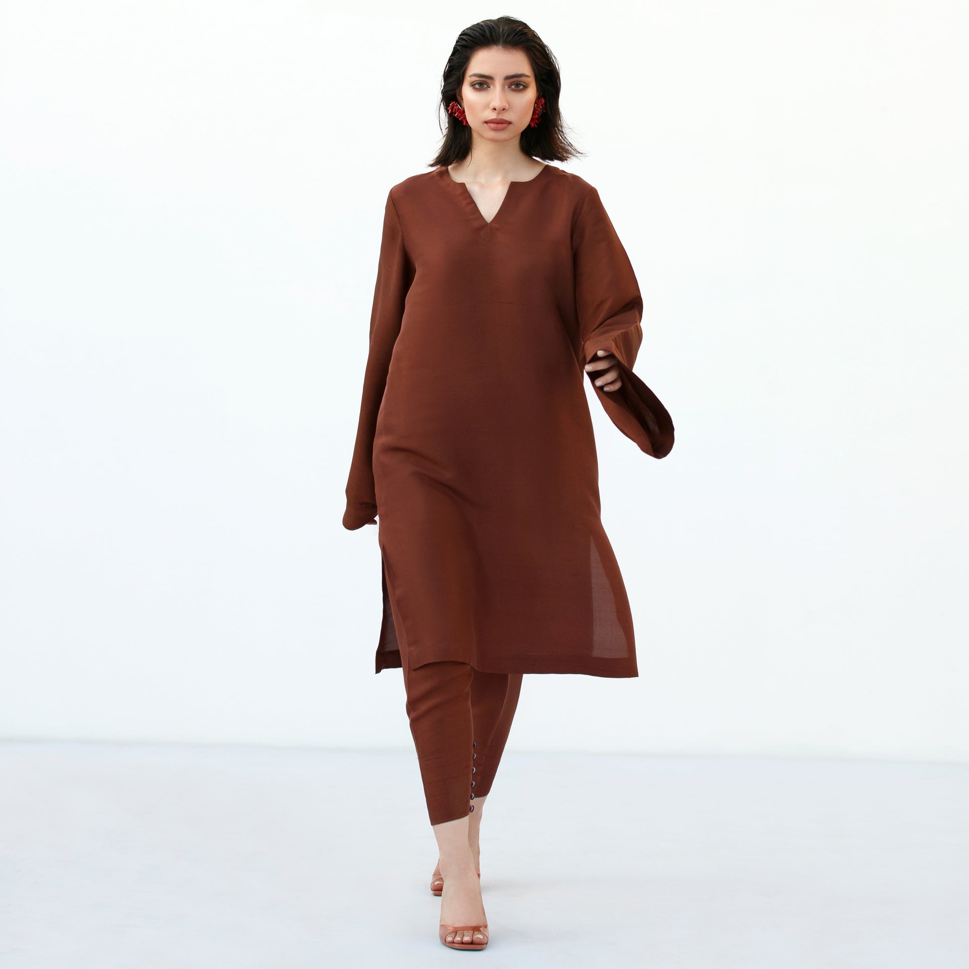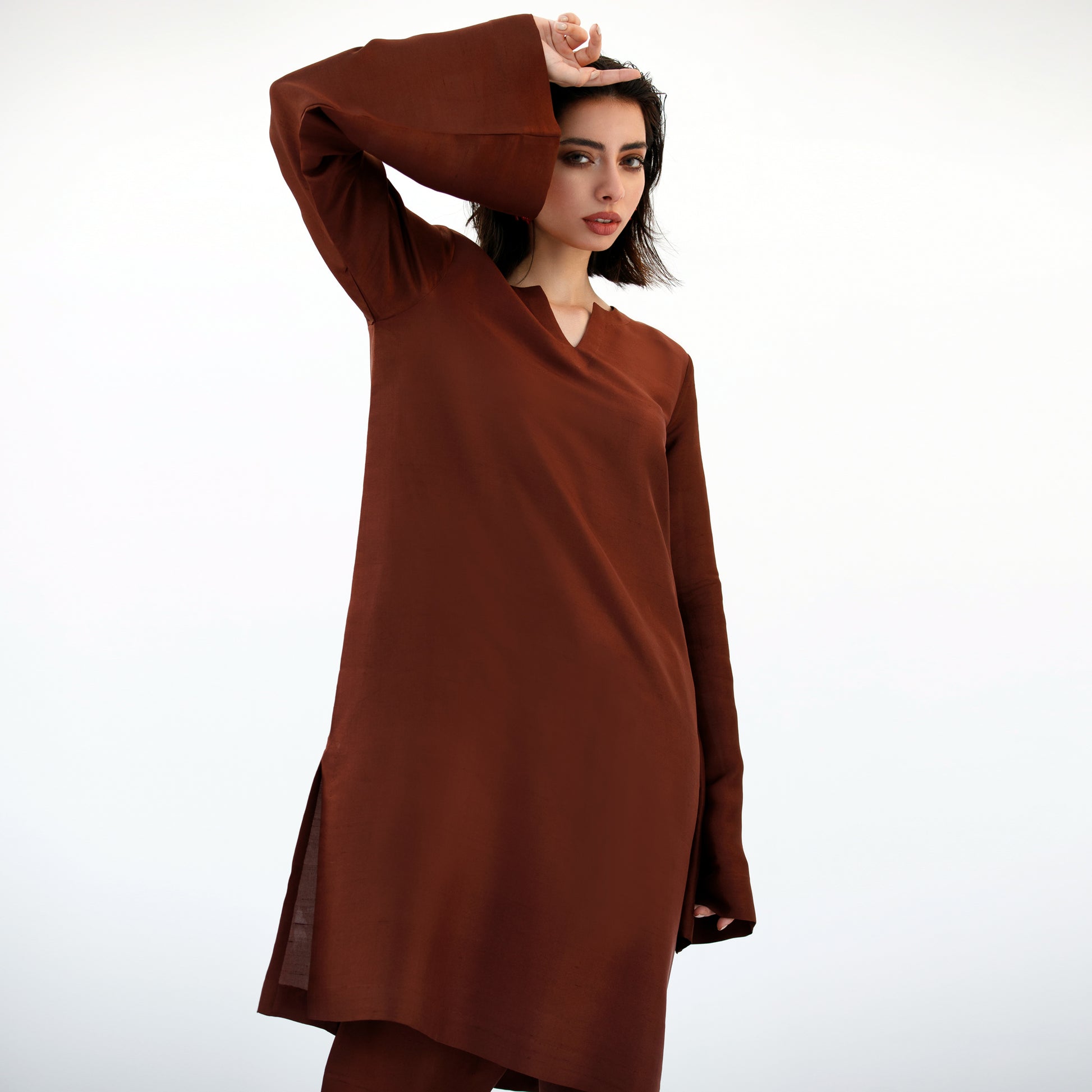 This 2 piece warm rust-brown outfit radiates understated elegance. The shirt features a soft V-cut neckline with long, slightly flared sleeves. The straight silhouette and matching pants with side button details offer a minimalistic & classy vibe.