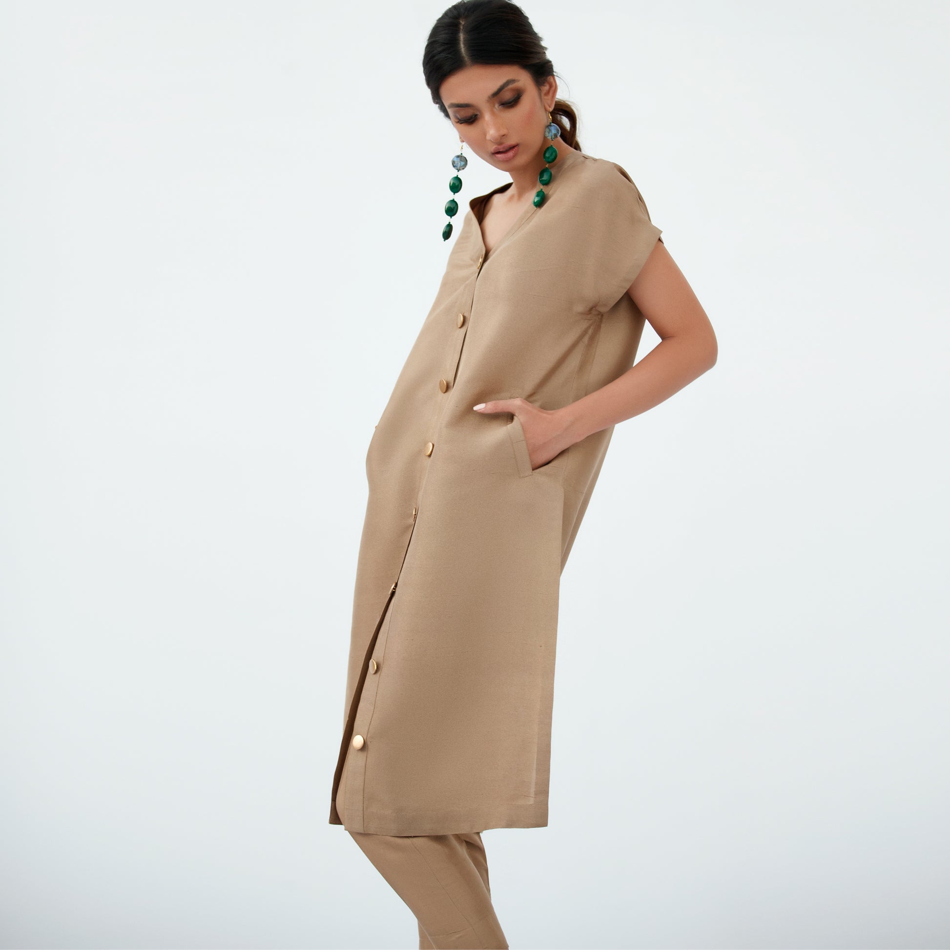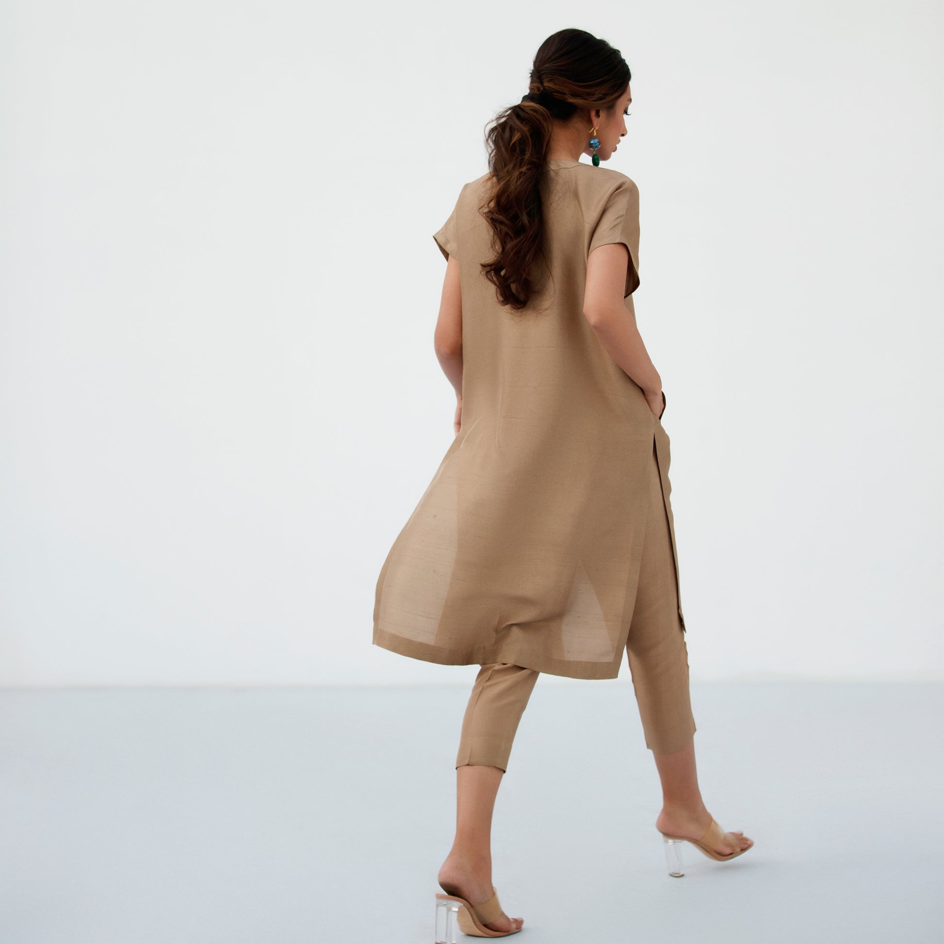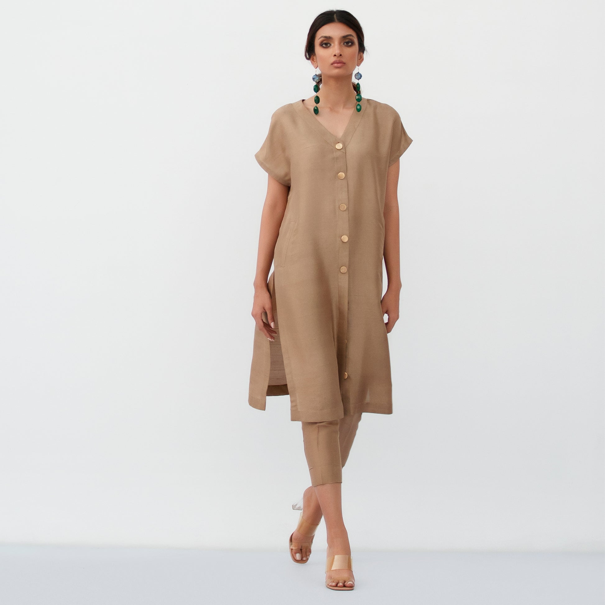 A gold raw silk ensemble featuring a structured shirt with fine gold accents, paired with crisp capri trousers for a modern finish. The organza dupatta, available separately, offers an optional layer of finesse.