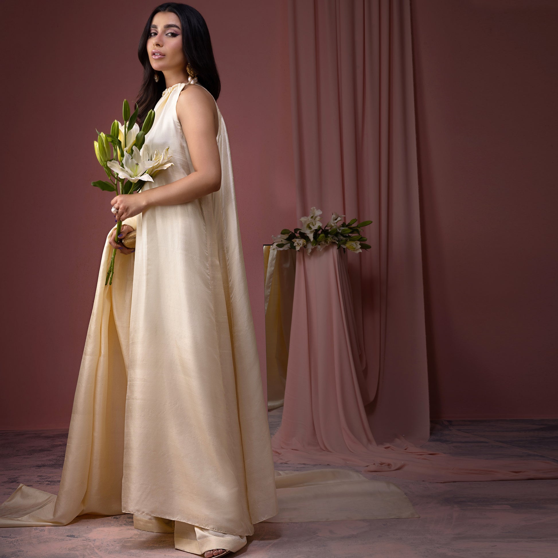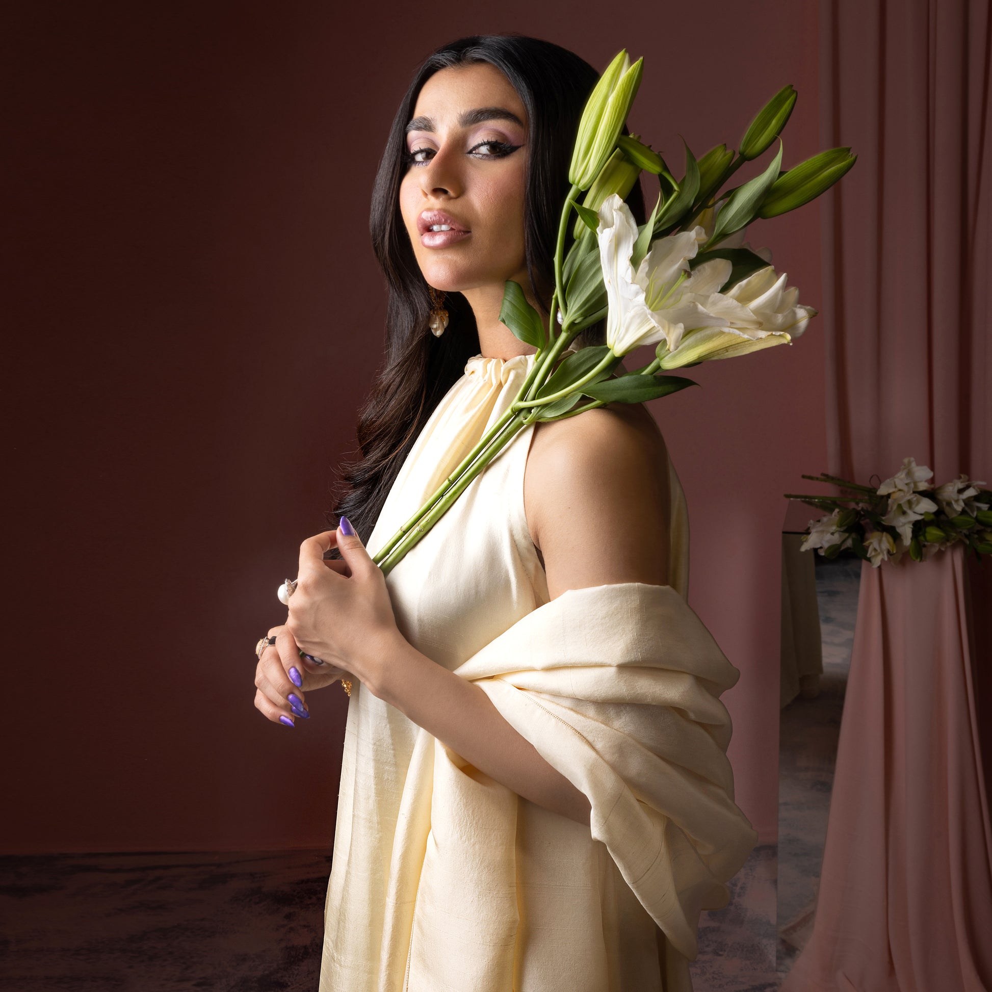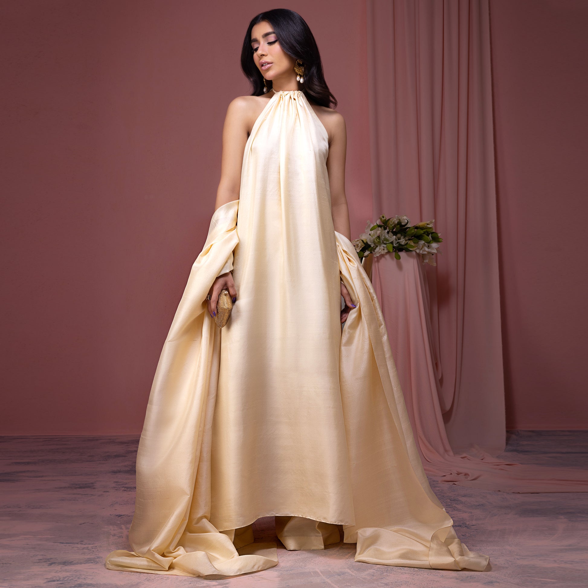 Crafted in lustrous pure raw silk, this ivory-gold ensemble flows with an air of regal minimalism. The halter neckline adds modern elevation, while the expansive fall creates a sculptural, statuesque silhouette. Paired with a matching pure raw silk dupatta, this look is a study in luxurious restraint.