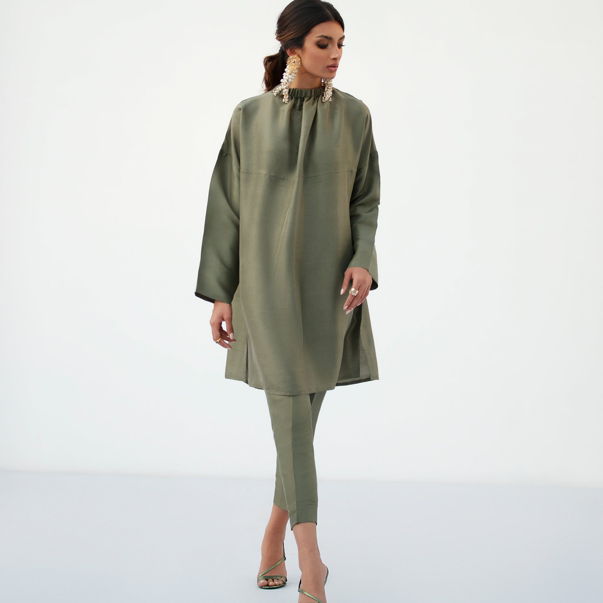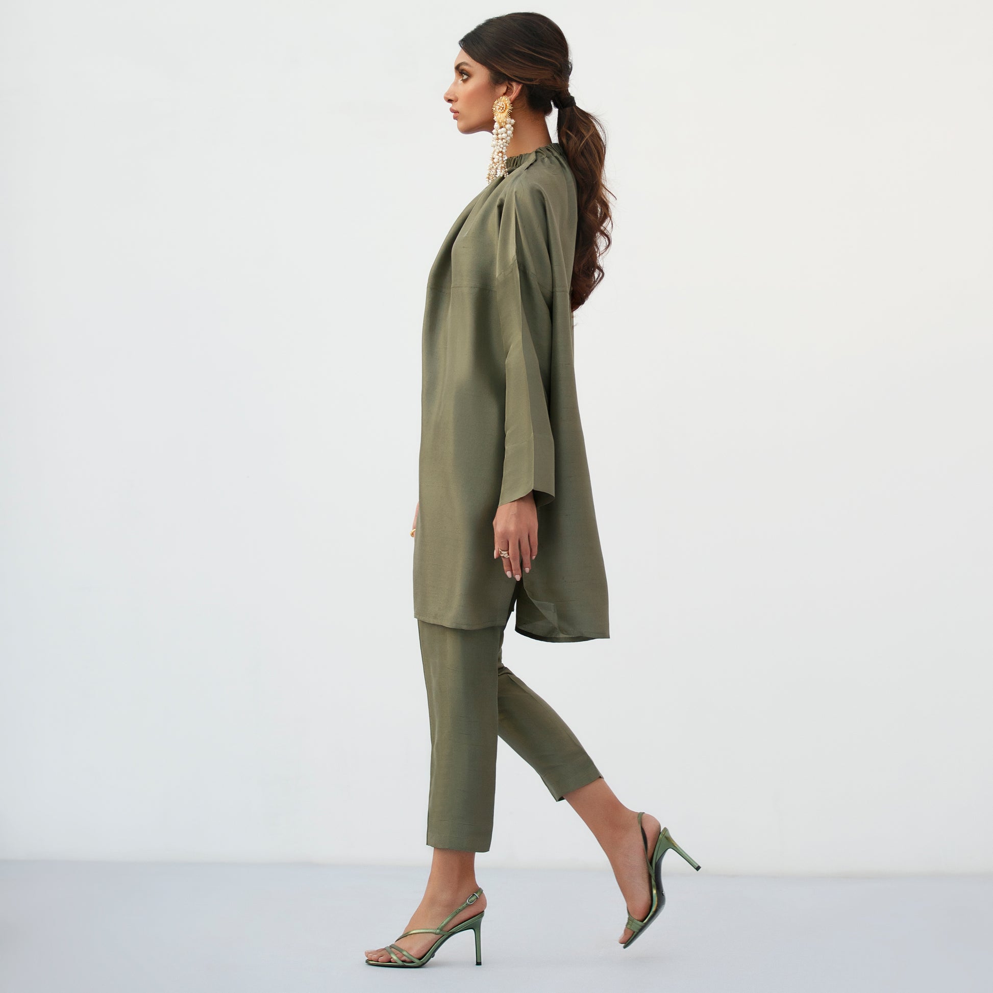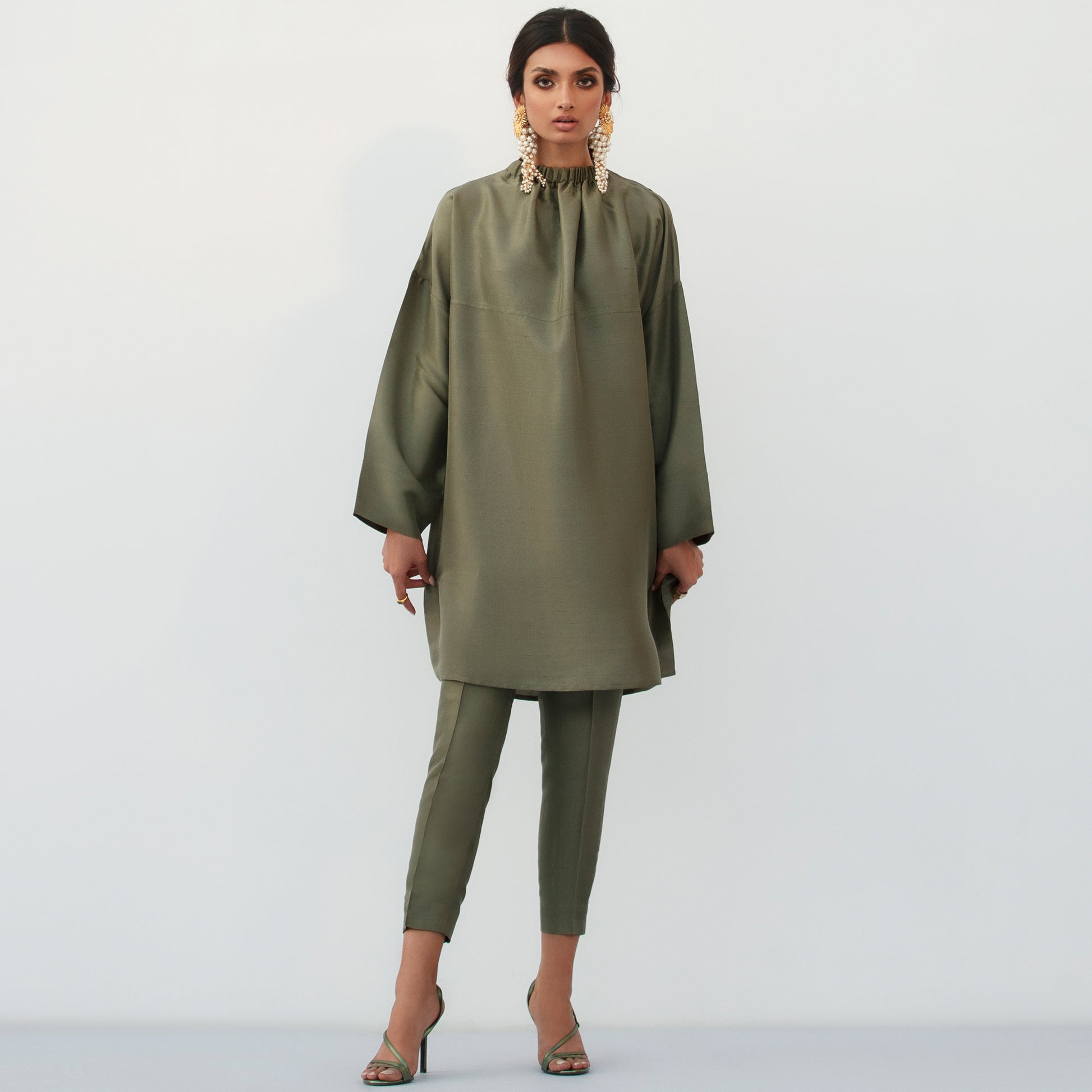 In a muted moss tone, this ensemble draws strength from subtle structure. The halter neckline curves into full-length sleeves, creating a refined tension between fluidity and form. Fitted trousers anchor the look with quiet precision.