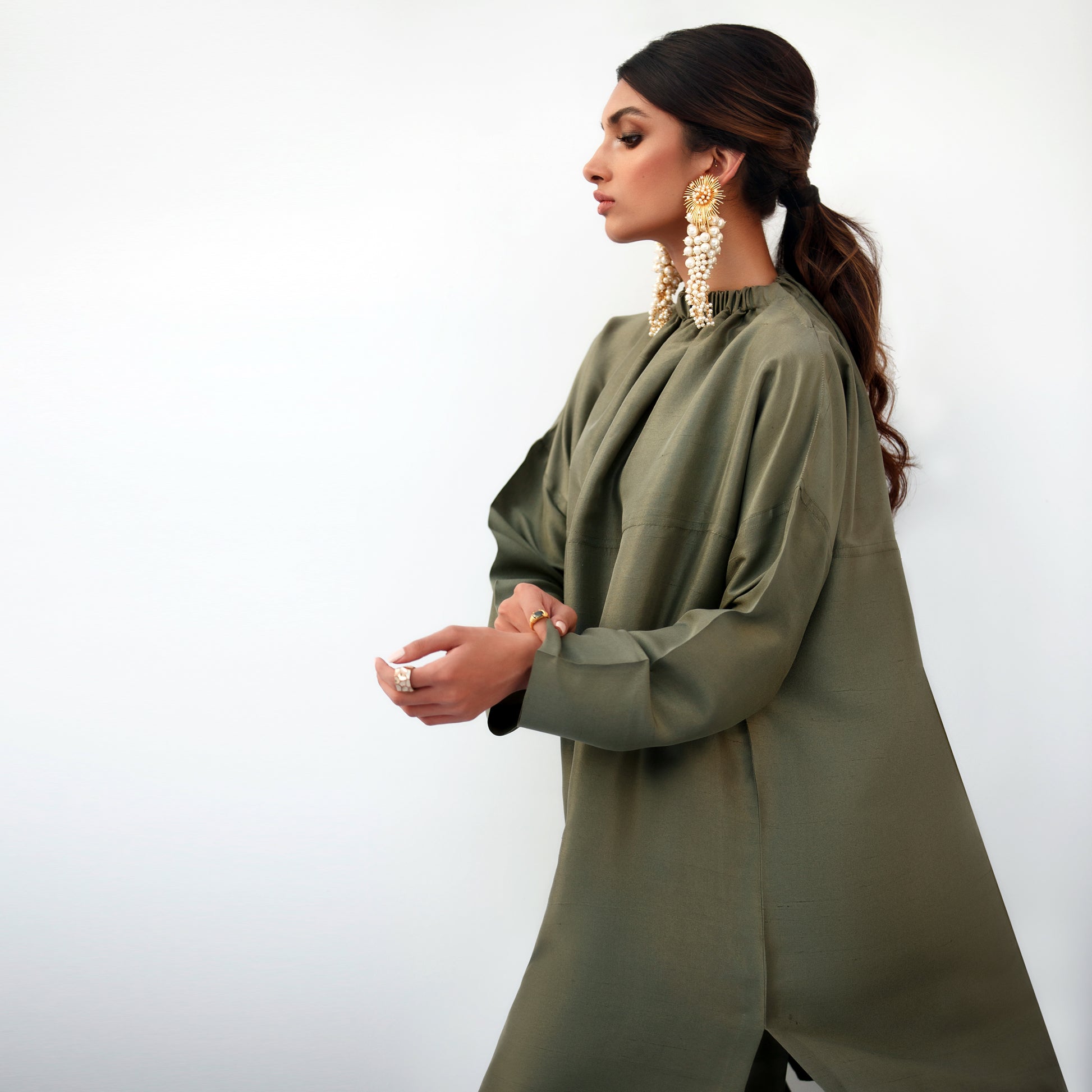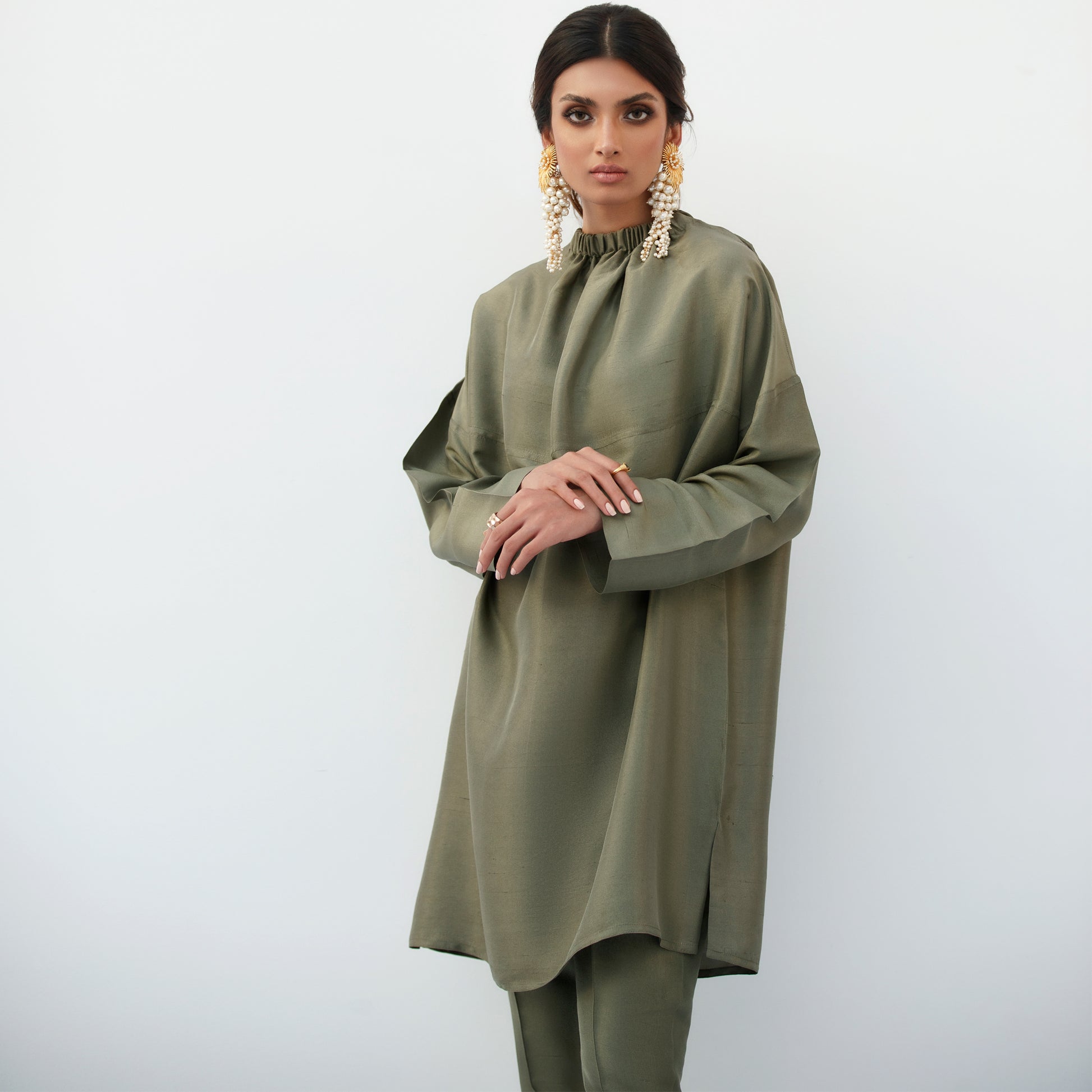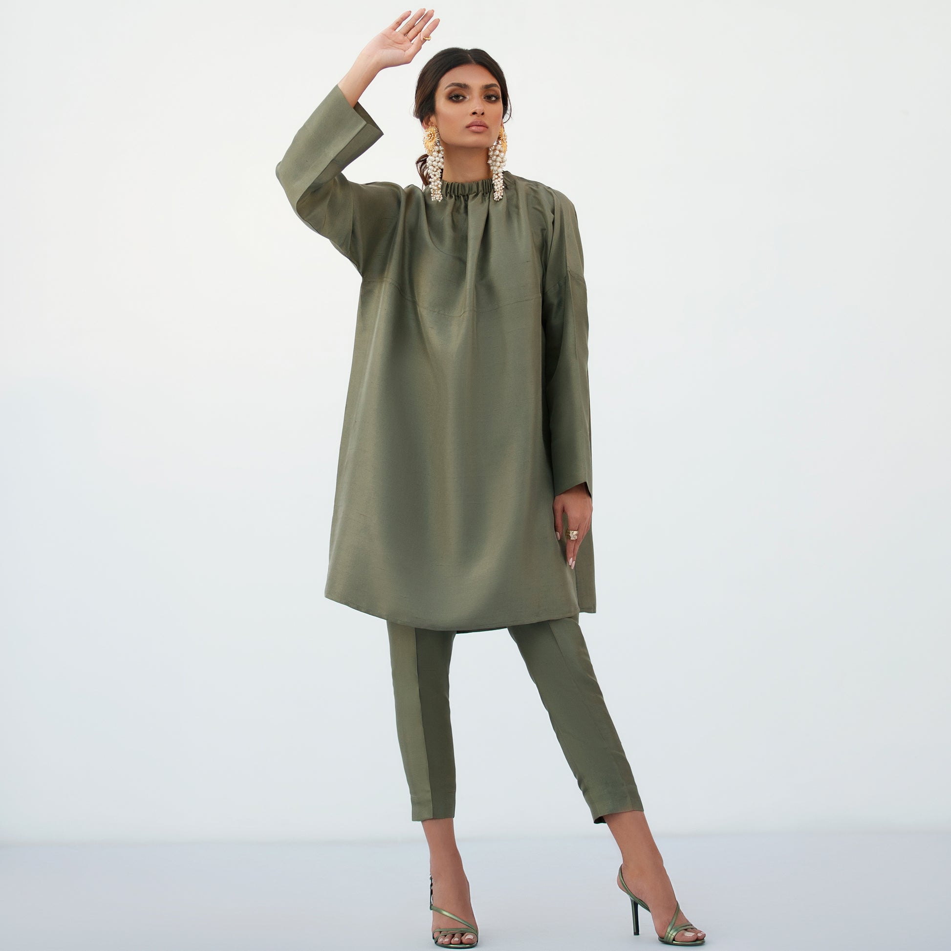 In a muted moss tone, this ensemble draws strength from subtle structure. The halter neckline curves into full-length sleeves, creating a refined tension between fluidity and form. Fitted trousers anchor the look with quiet precision.