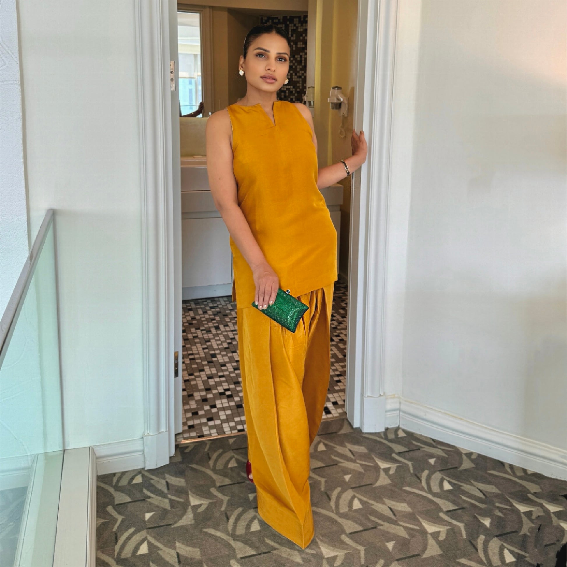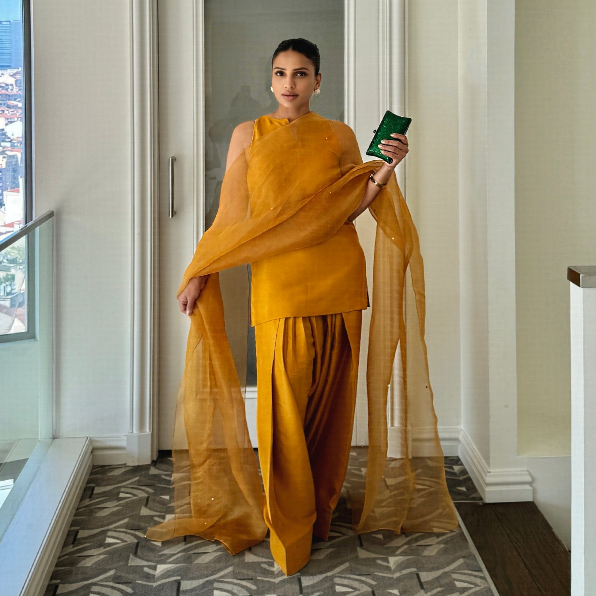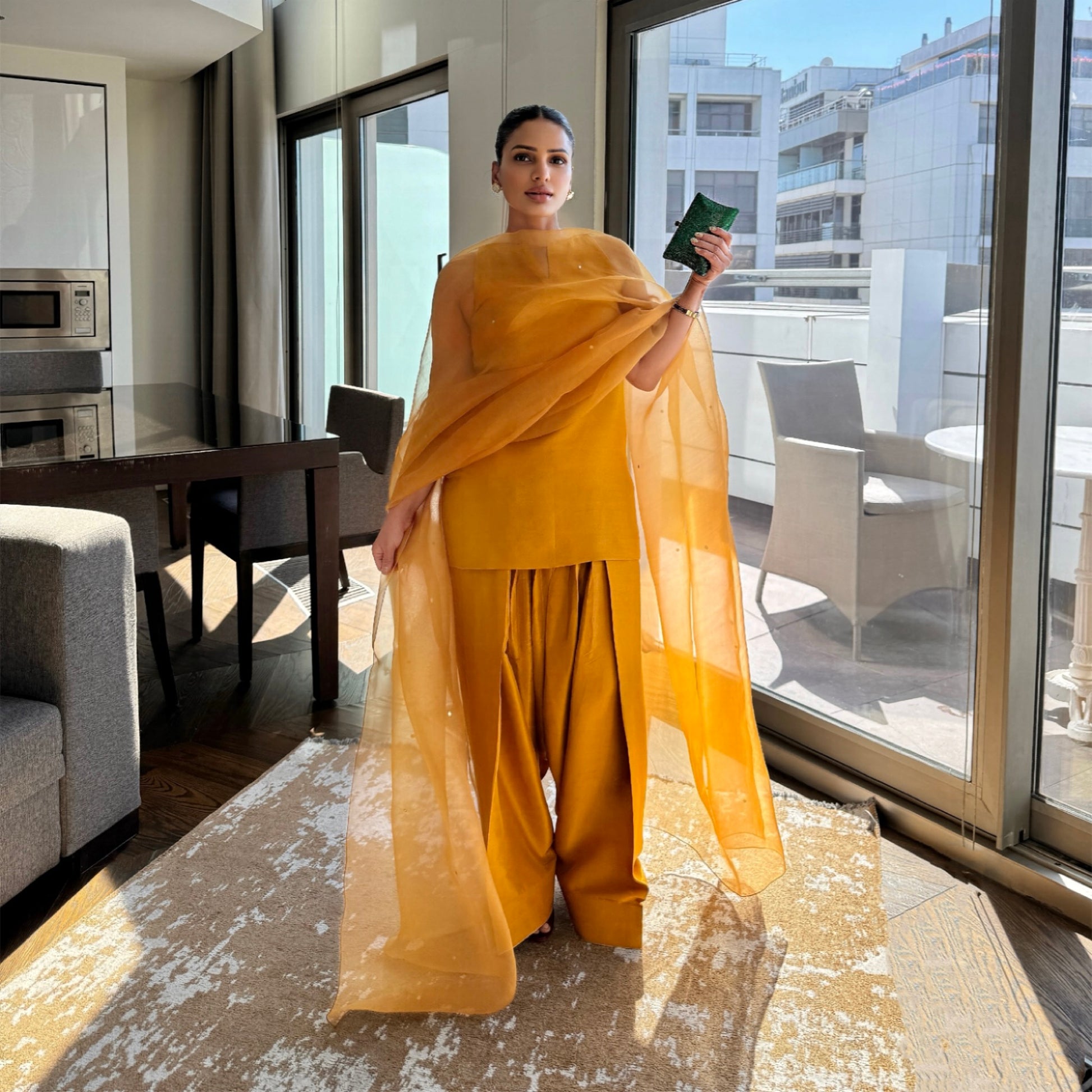 A refined mustard raw silk ensemble featuring a classic farshi shalwar that adds timeless elegance. The structured silhouette of pure raw silk offers a clean, graceful presence, while the matching organza dupatta with stud detailing brings a subtle hint of sparkle. This minimal yet striking look is ideal for sophisticated daytime occasions.