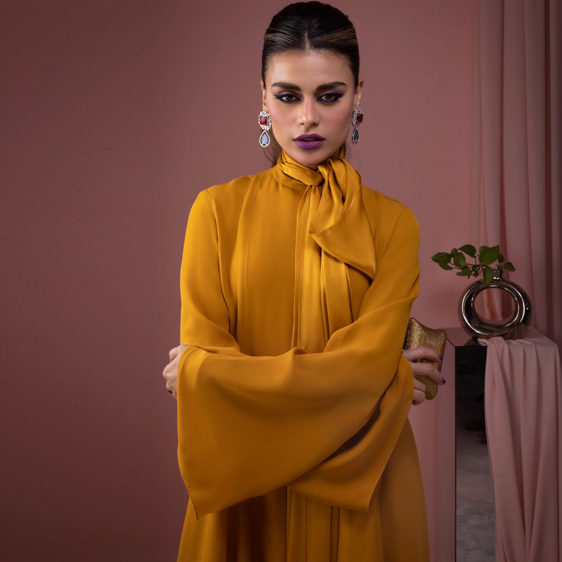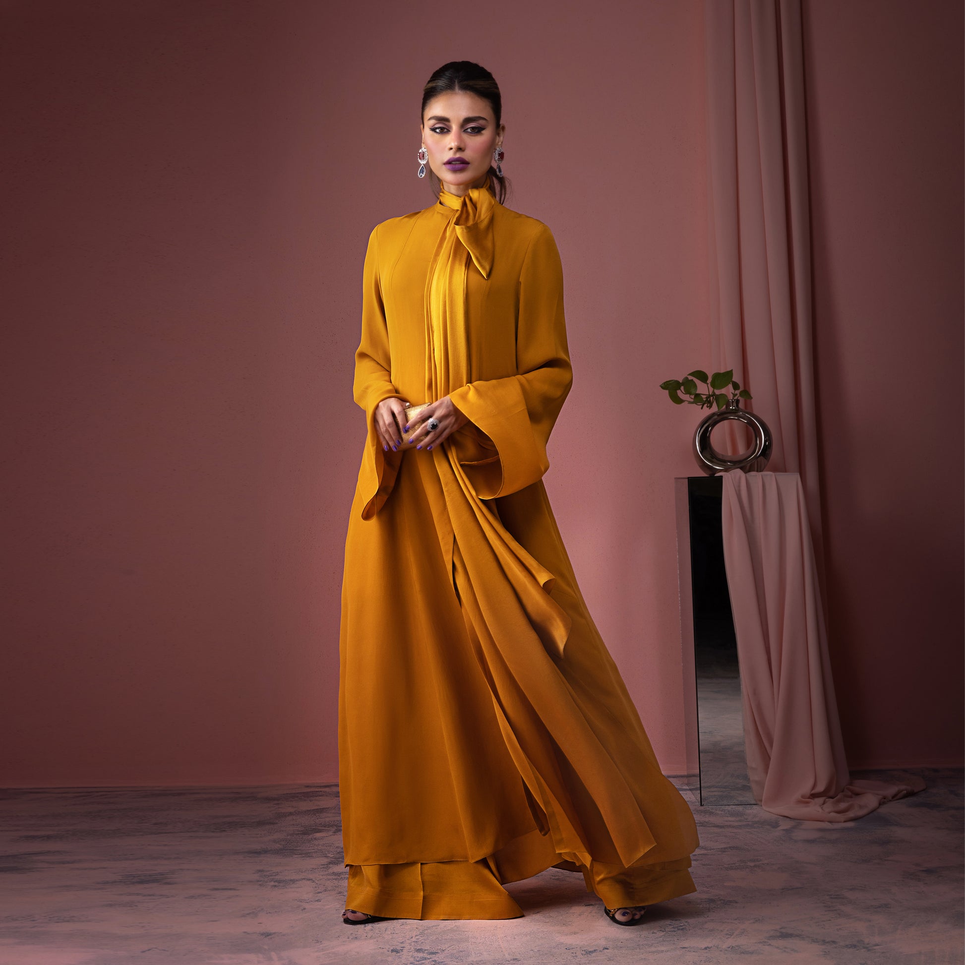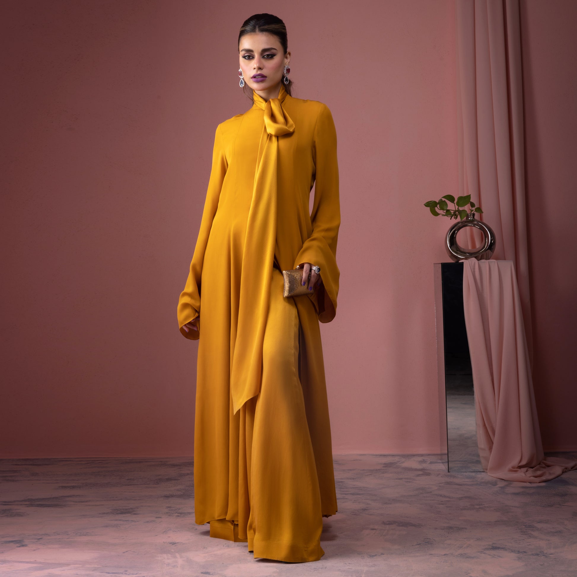 This mustard three-piece ensemble is an elegant choice for those who embrace modest fashion. The flowing georgette shirt features flared sleeves and a refined, elongated silhouette, complemented by sleek charmeuse silk trousers. A coordinated charmeuse scarf, styled around the neckline, brings a polished, contemporary finish blending modesty with modern sophistication.
