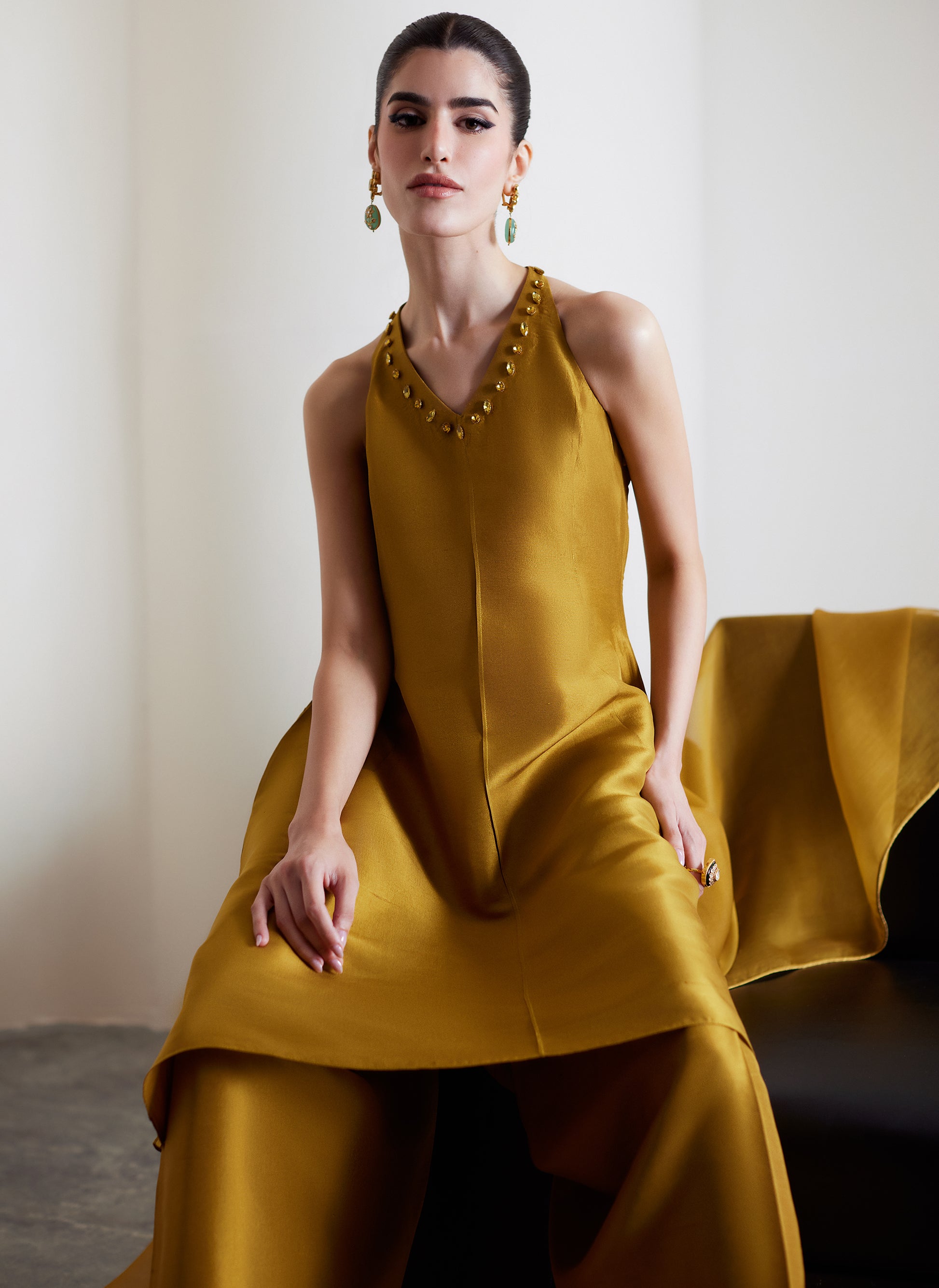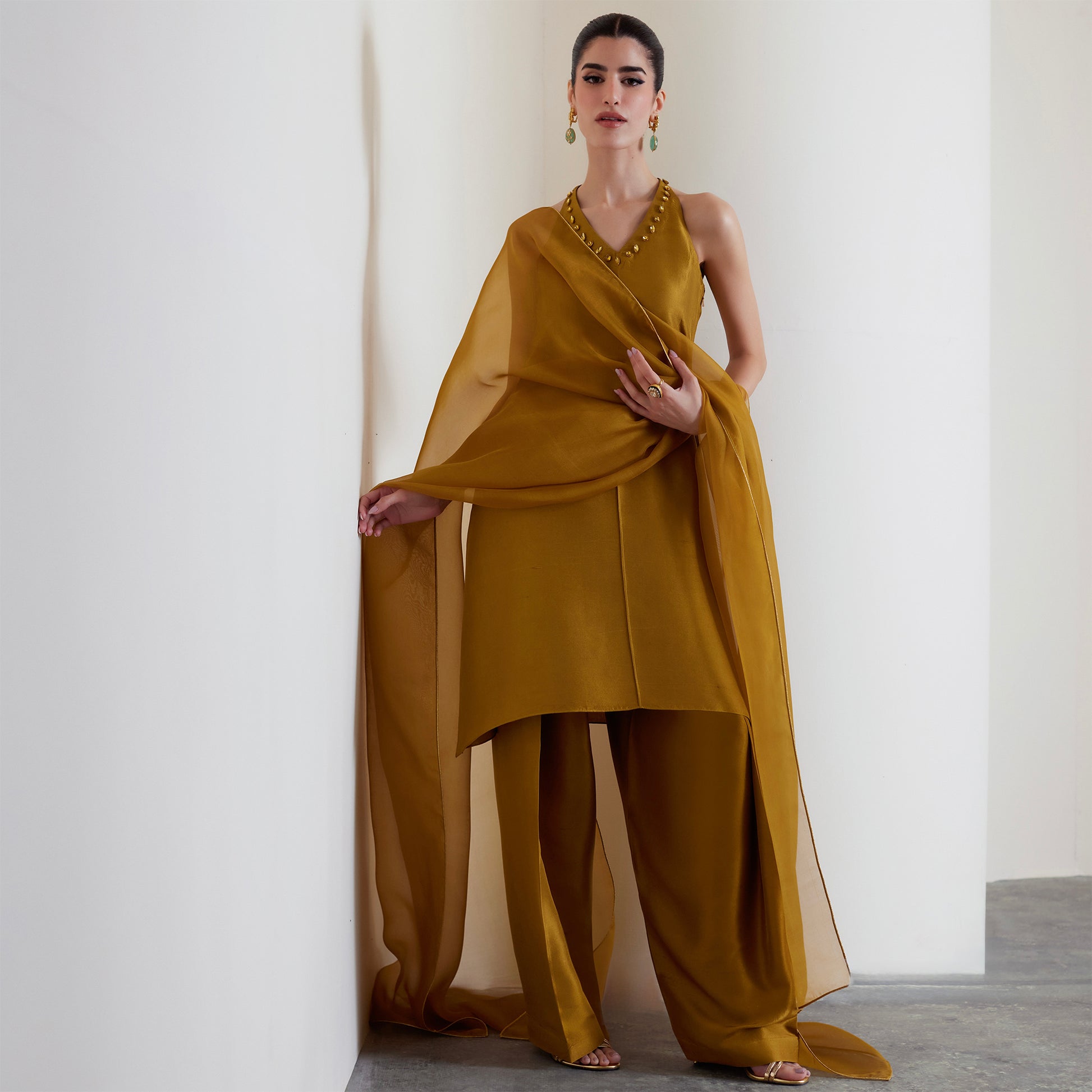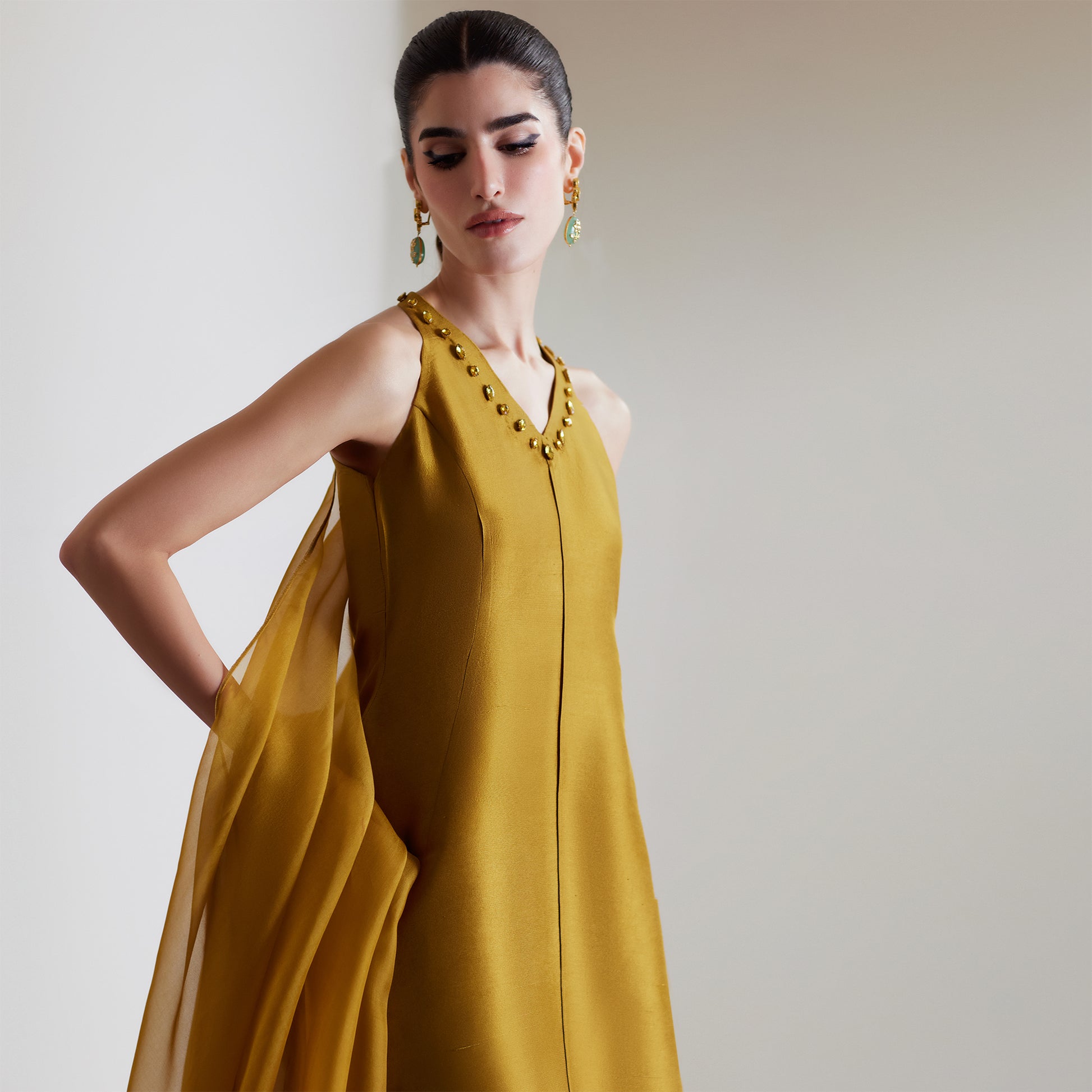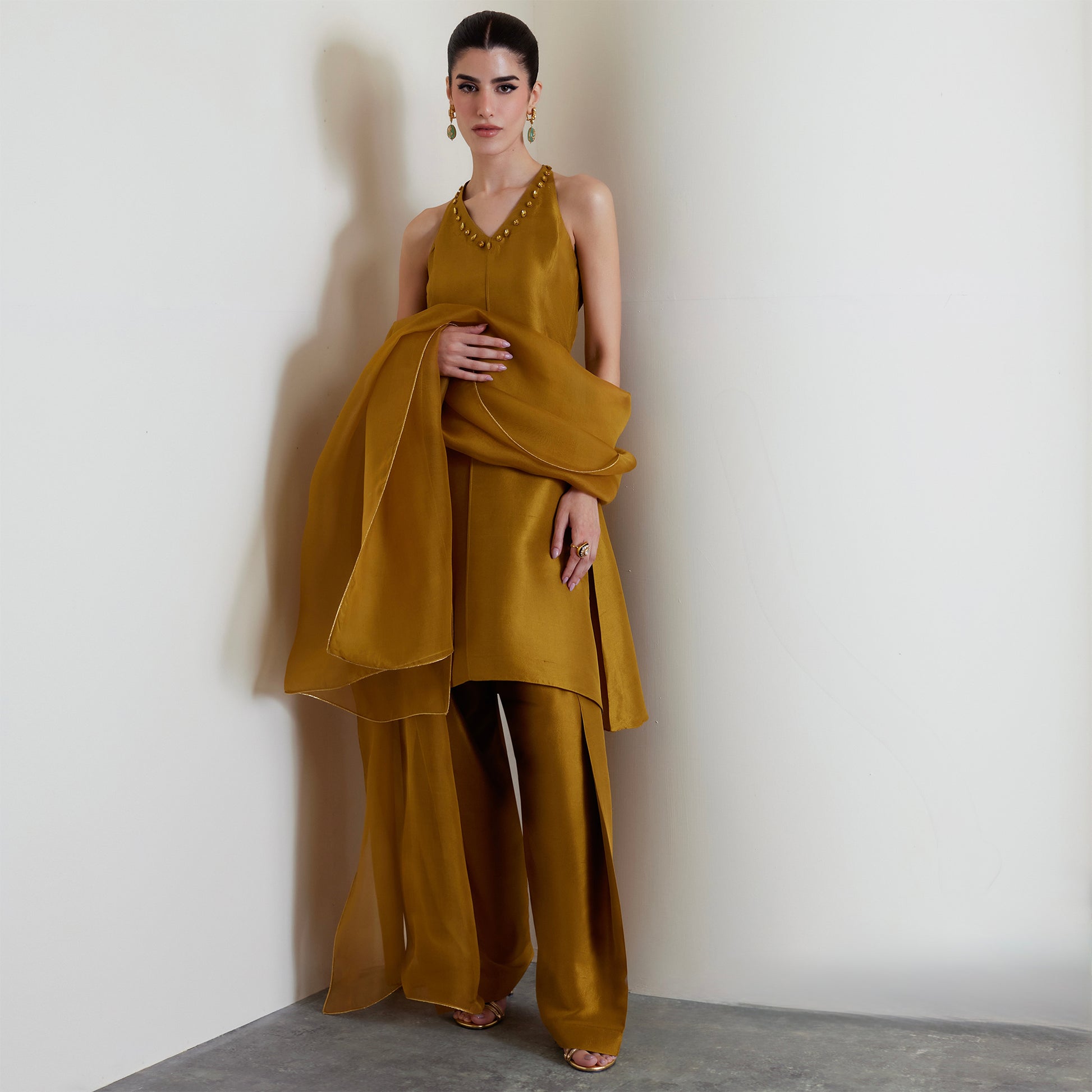 This mustard ensemble exudes refined elegance with its V-neckline adorned in subtle embellishments. A precisely placed dart along the front center adds structure and shape to the design. The flowing farshi shalwar brings a traditional flair, while the soft organza dupatta completes the look with minimal elegance.