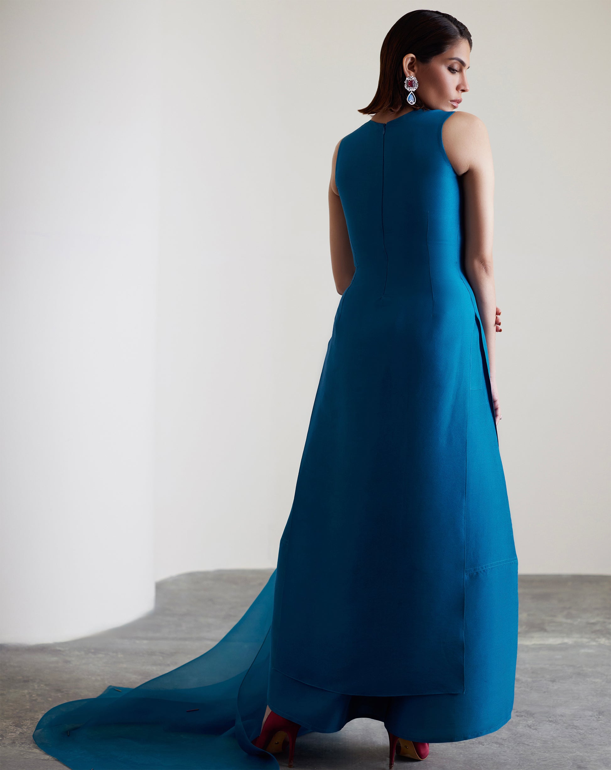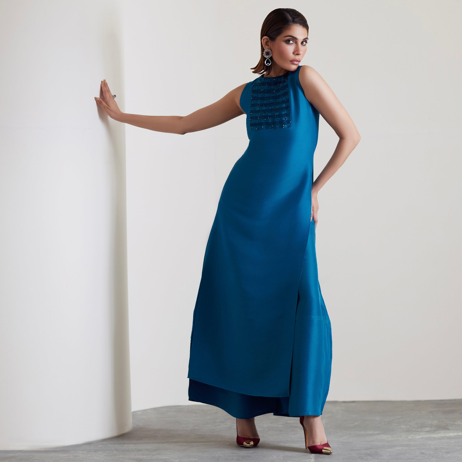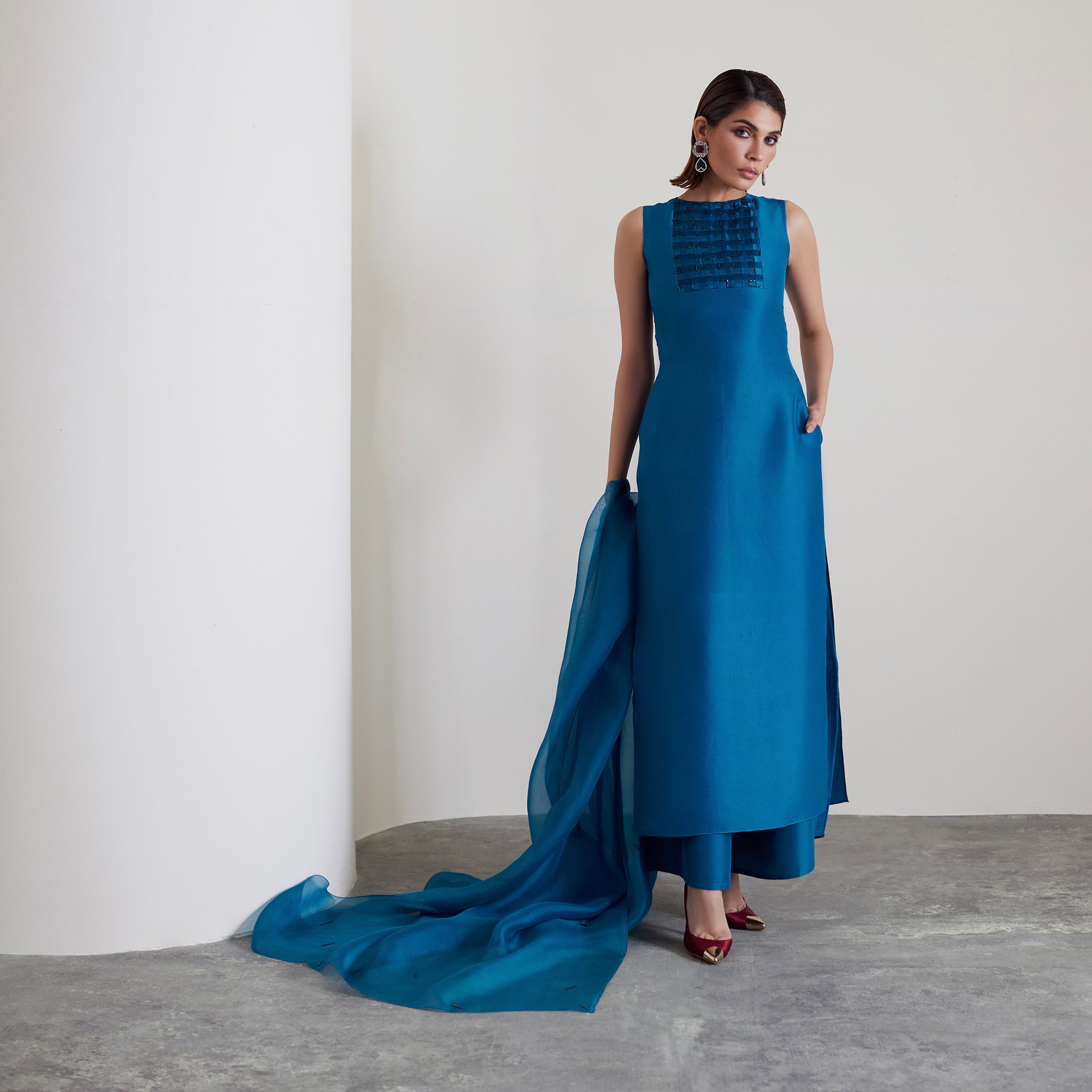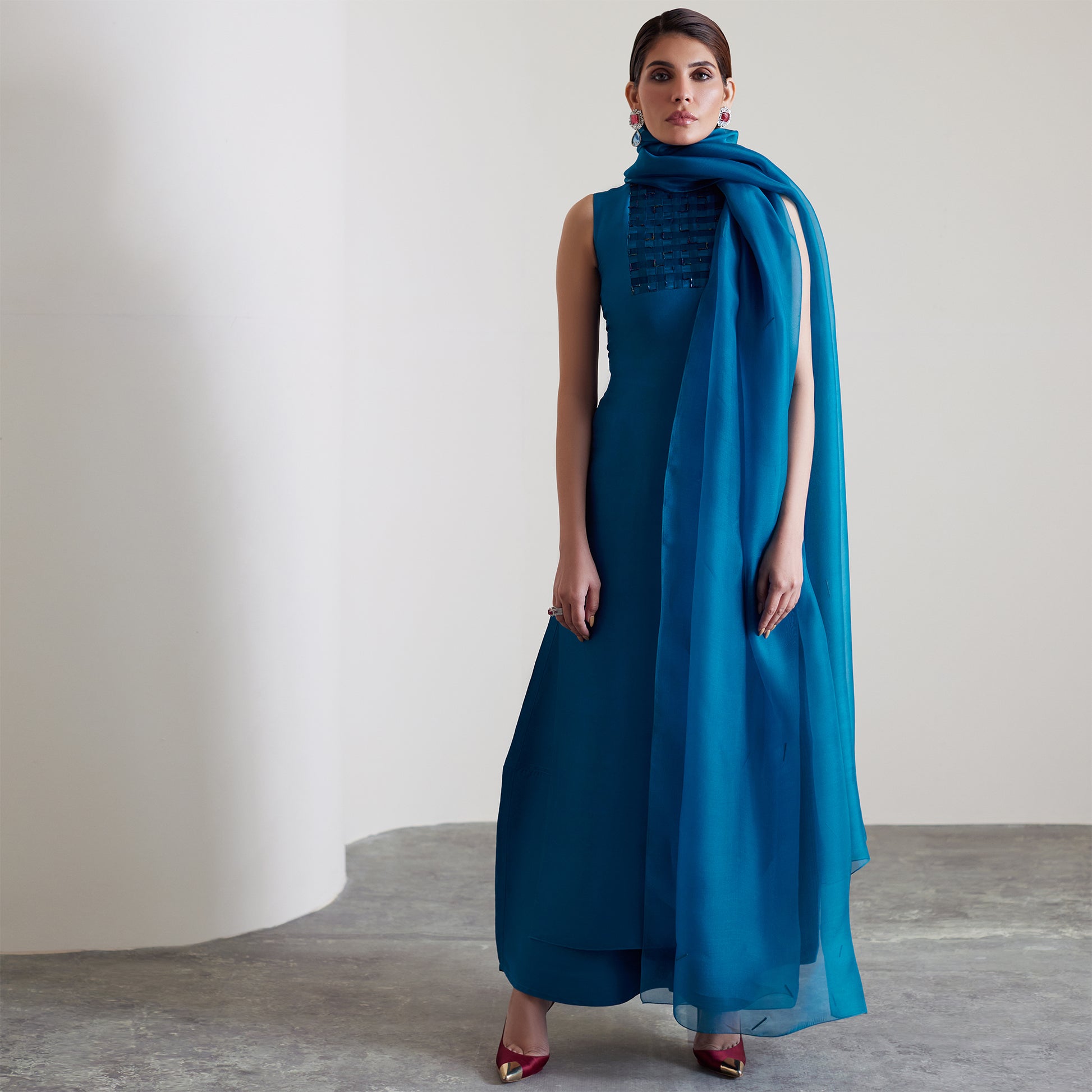 Bold yet refined, this teal blue ensemble channels quiet strength with a modern edge. The structured A-line cut is enhanced by intricate embellishments and fine fabric manipulation around the neckline and bust, creating an artful play of texture. The hemline is slightly tapered for a flattering finish, while an organza dupatta with delicate embellishments drapes softly to complete the look. Coordinated balloon pants add a polished, modern look.