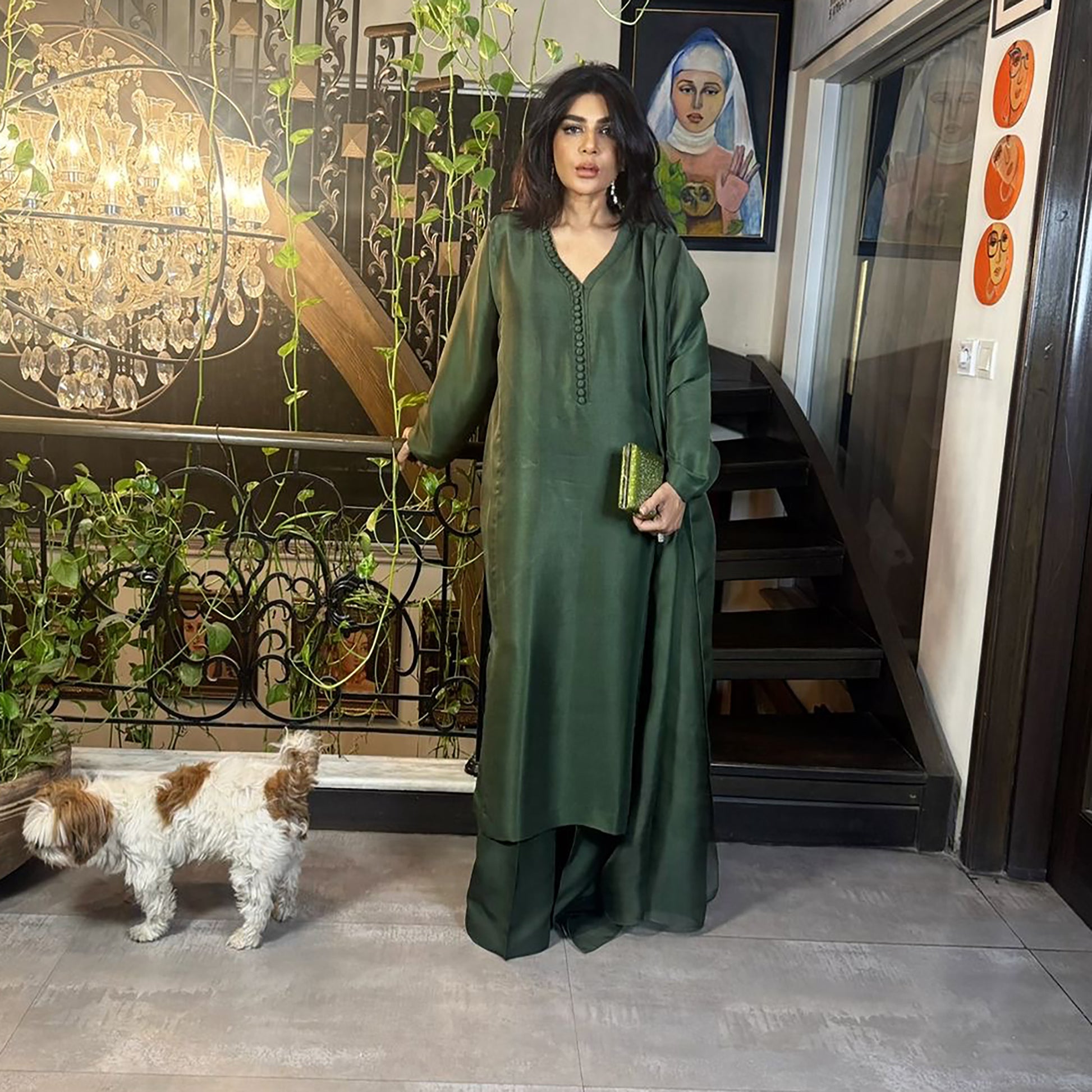 She is wearing a traditional outfit in a rich army green color, made from pure raw silk, which gives it a textured yet refined appearance. The ensemble includes a long, loose kurta with subtle button detailing and matching wide-legged trousers. Draped over one shoulder is a delicate organza dupatta, adding a light, airy contrast to the heavier silk fabric.
