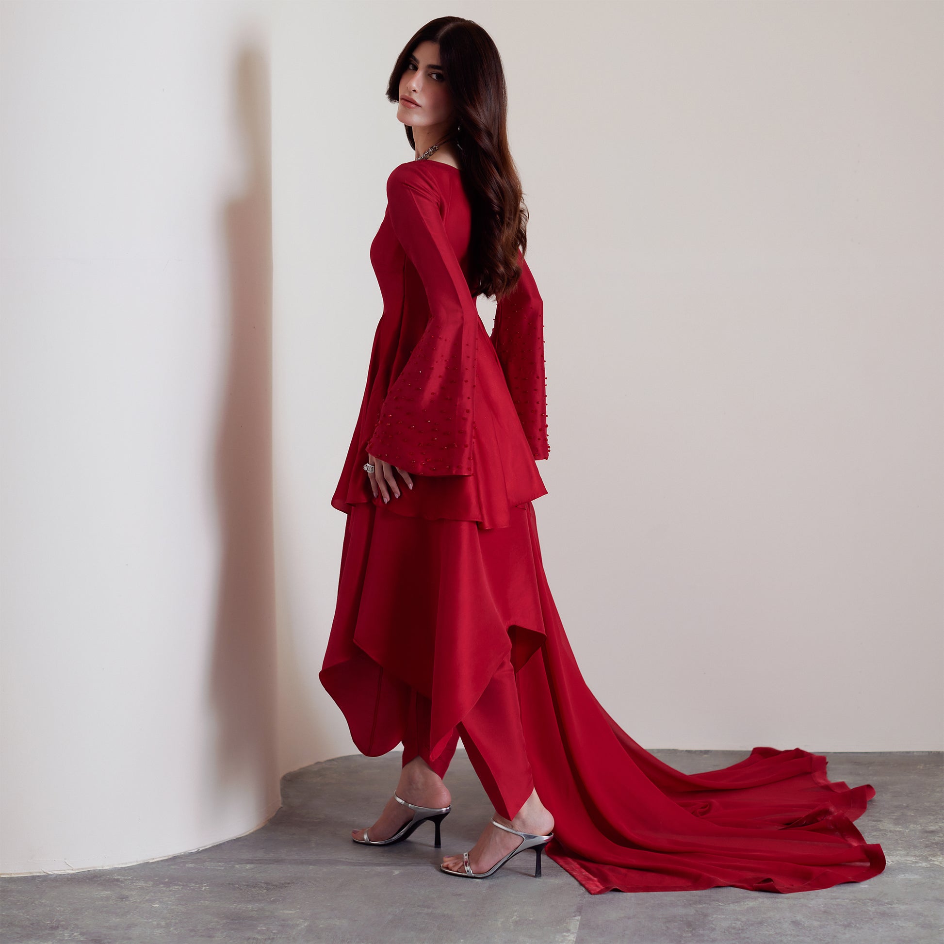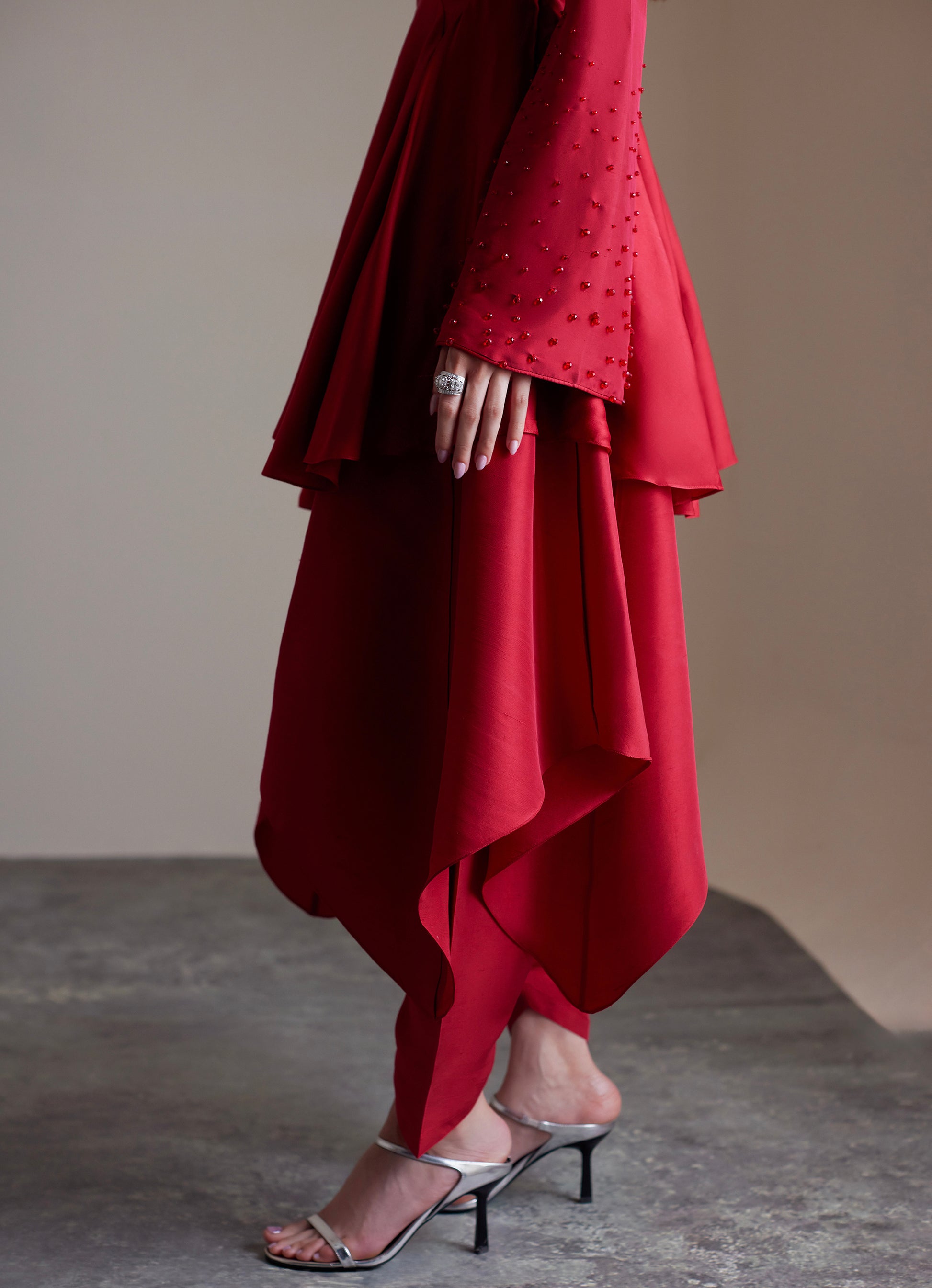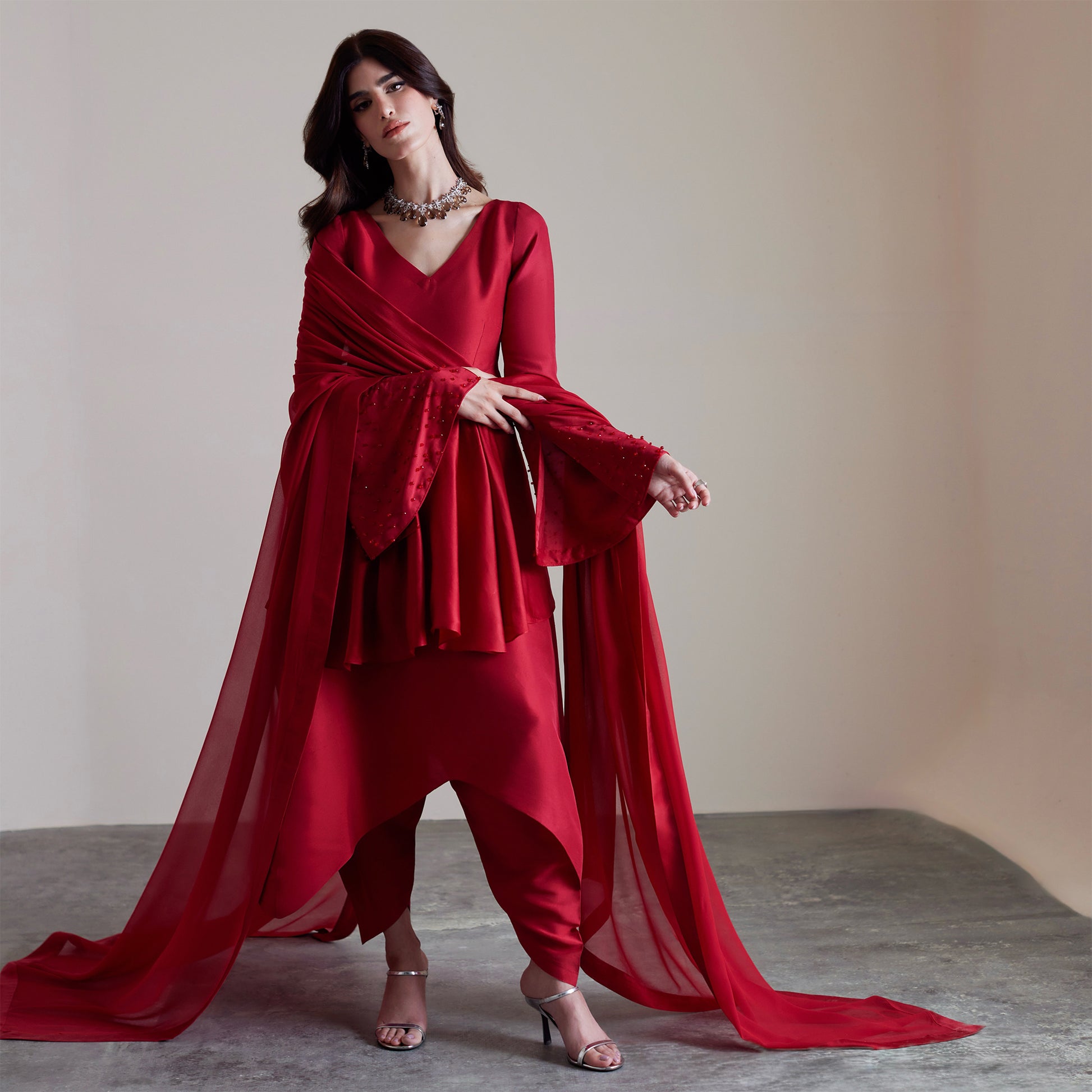 This red layered outfit features flowing charmeuse silk panels that add movement and volume, while the rest of the shirt is made from pure raw silk. The rich red color stands out, and subtle embellishments on the sleeves provide a hint of detail. Paired with a tulip shalwar and a chiffon dupatta with delicate charmeuse silk detailing, it is designed for both elegance and ease.