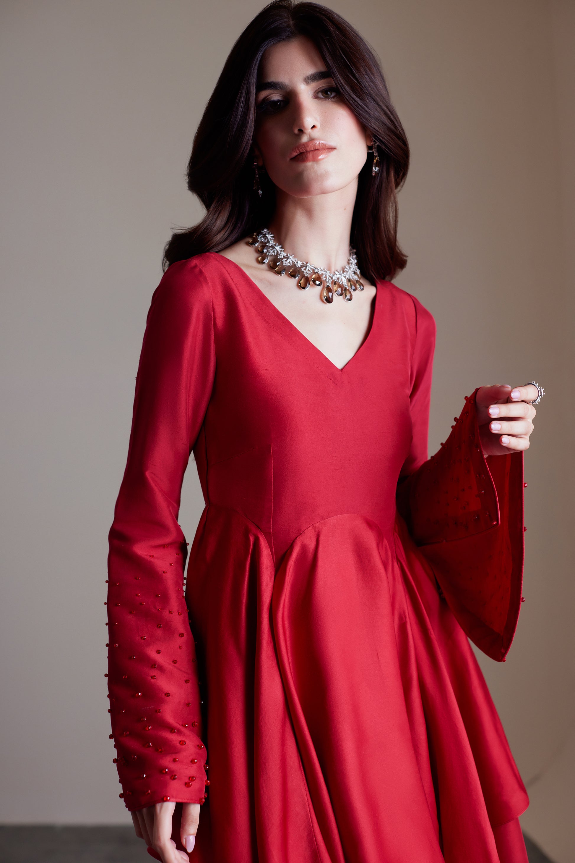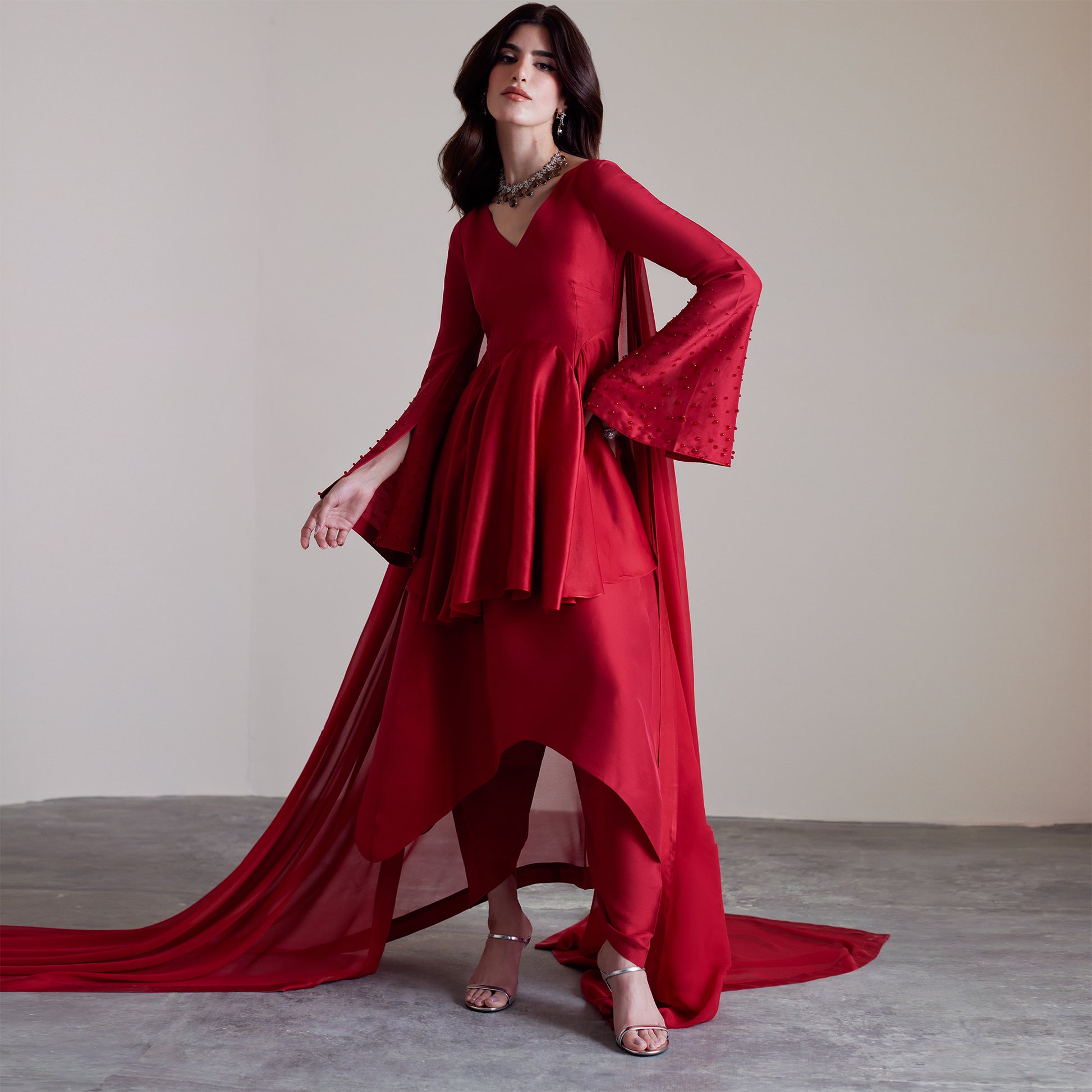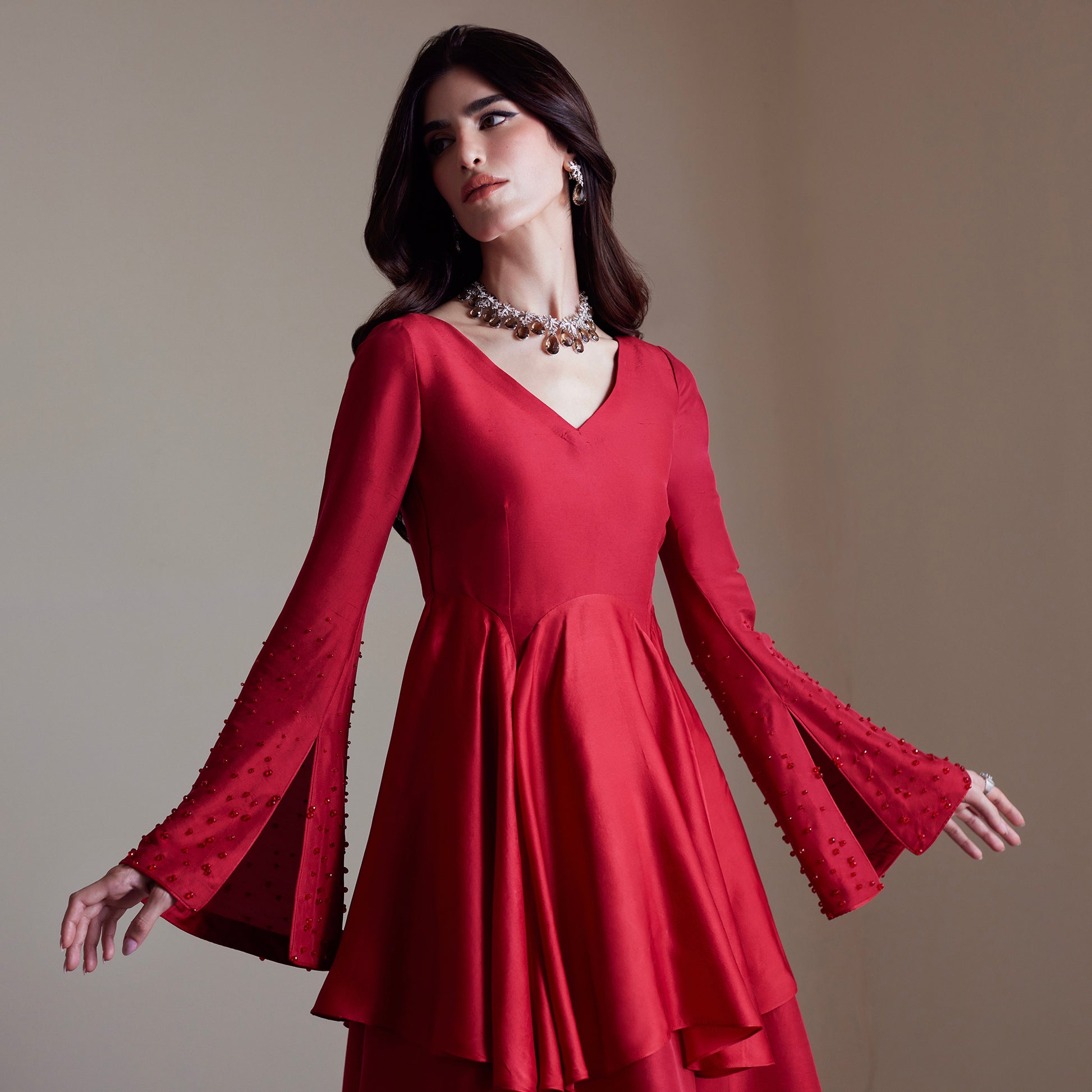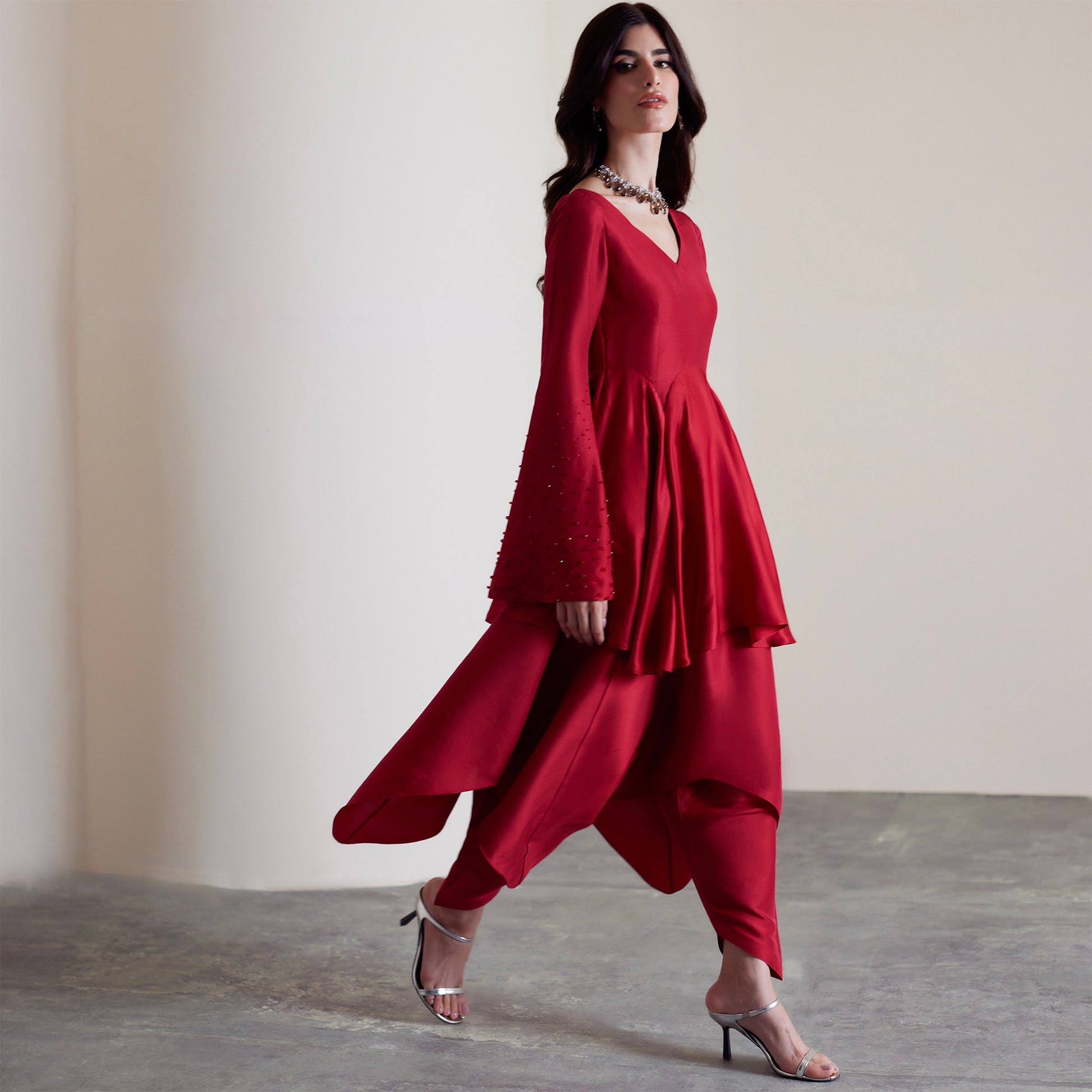 This red layered outfit features flowing charmeuse silk panels that add movement and volume, while the rest of the shirt is made from pure raw silk. The rich red color stands out, and subtle embellishments on the sleeves provide a hint of detail. Paired with a tulip shalwar and a chiffon dupatta with delicate charmeuse silk detailing, it is designed for both elegance and ease.