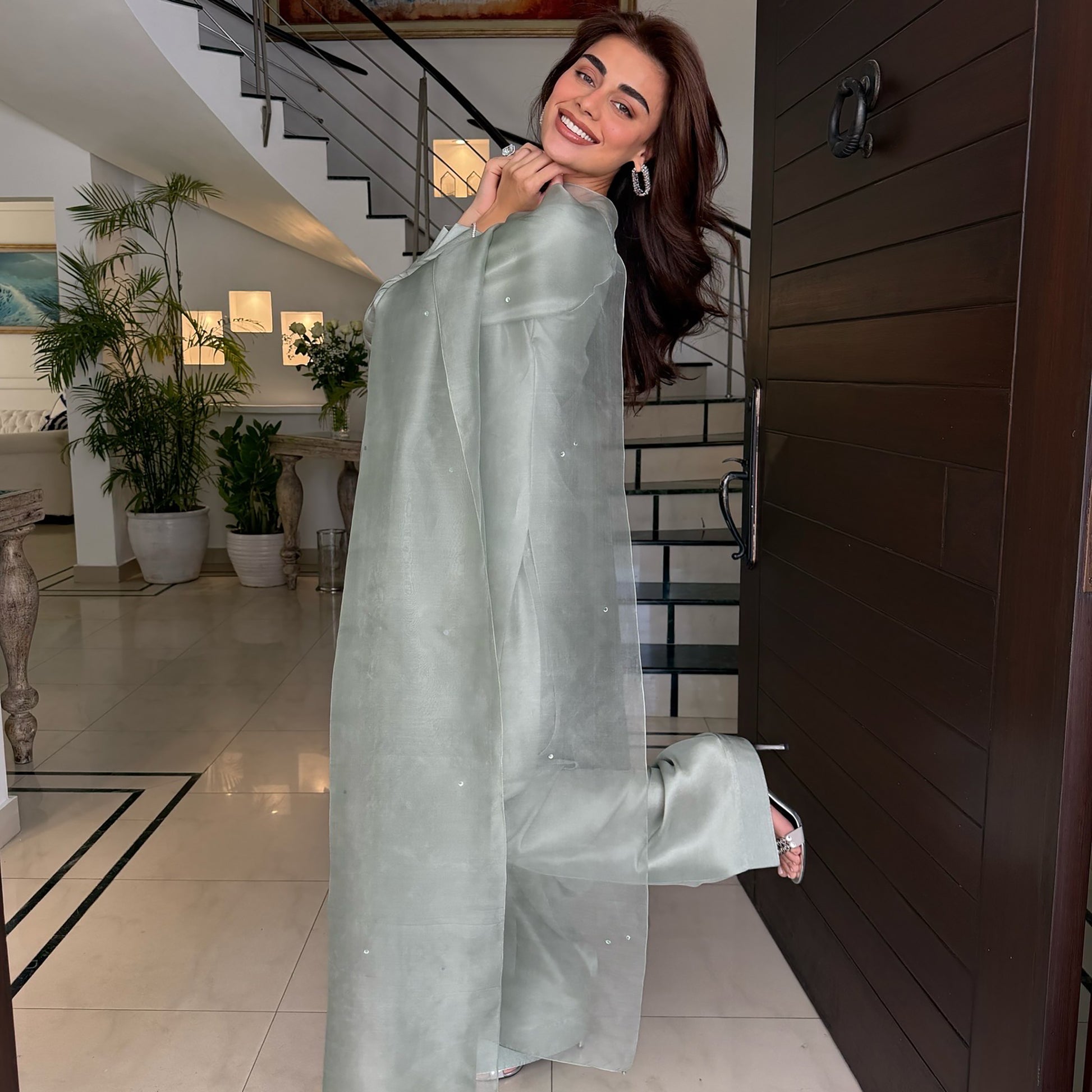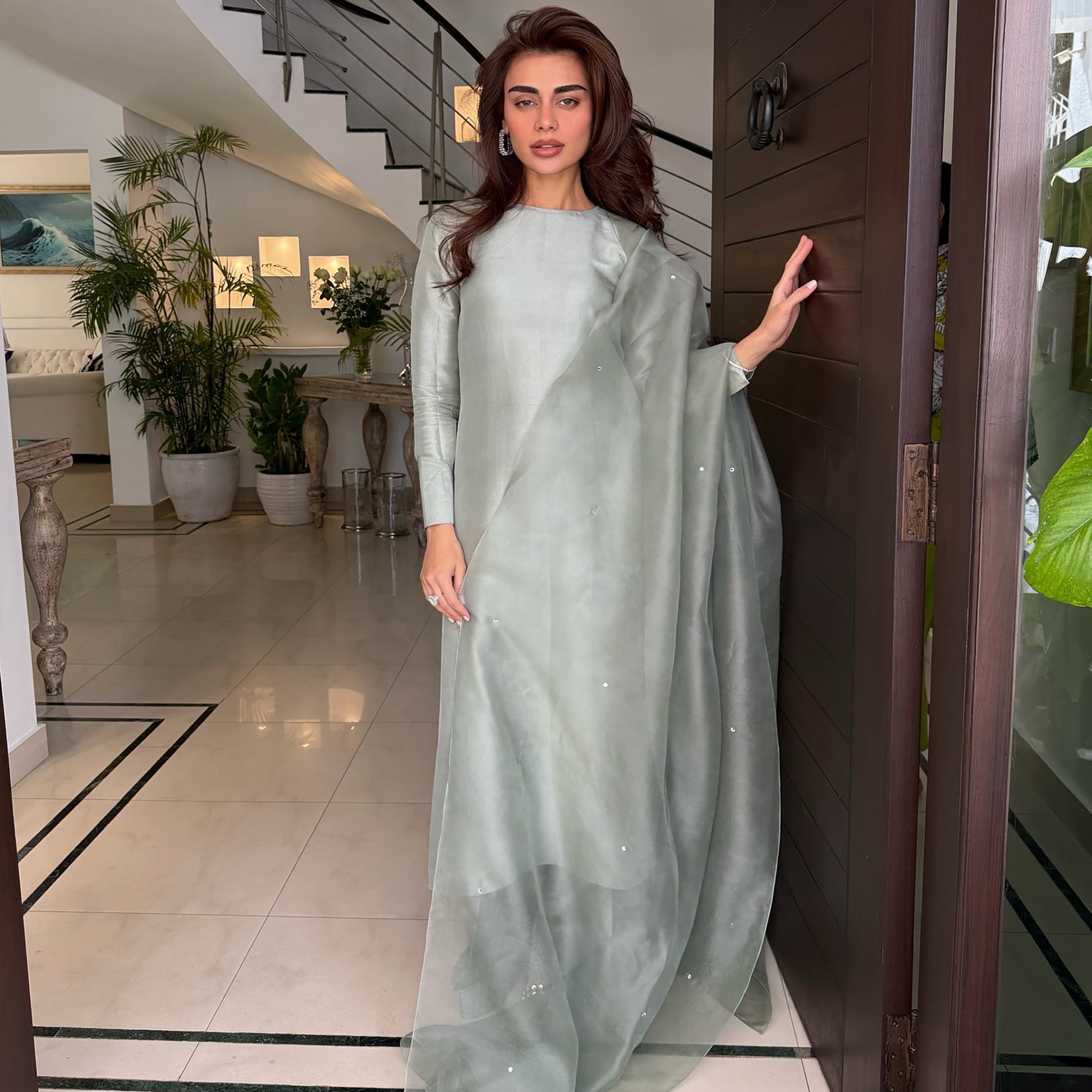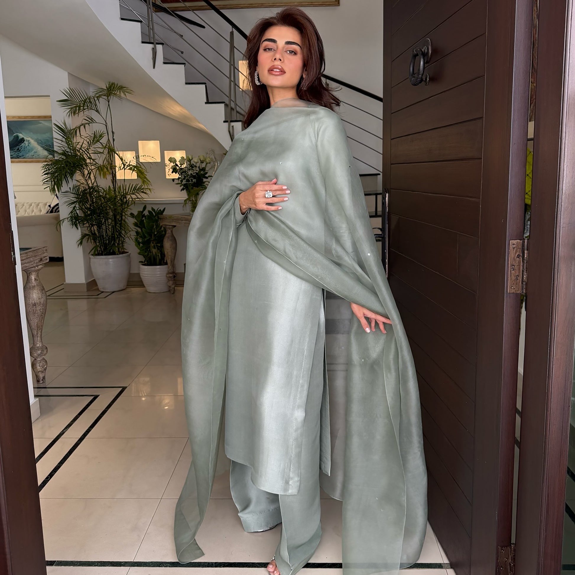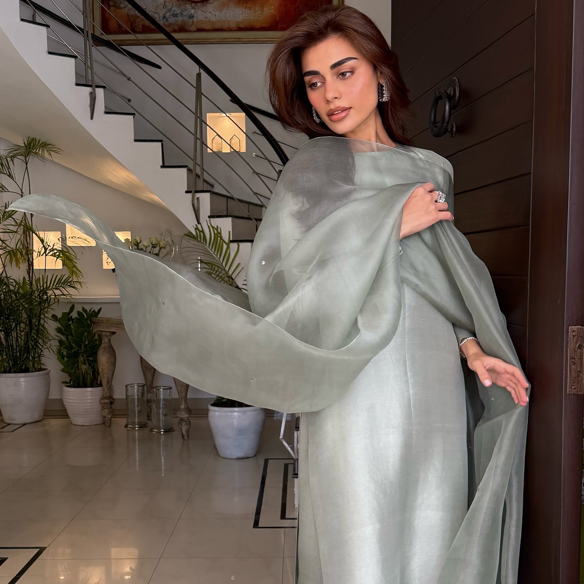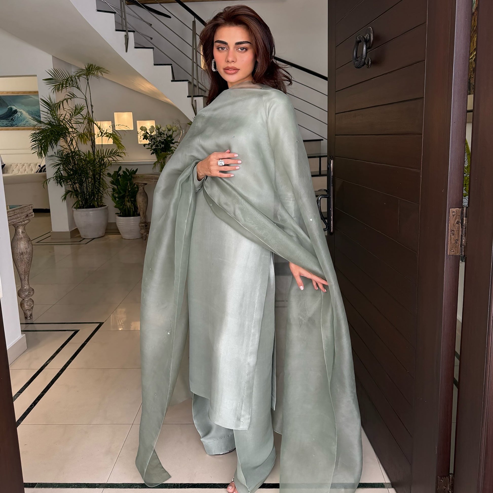 A mint green outfit featuring a straight-cut long shirt with full cuff sleeves and halter-style lining around the neckline and shoulders, adding a subtle touch of structure. Paired with matching farshi shalwar and a pure organza dupatta, the look is fresh, minimal, and perfect for daytime occasions with a modern twist.