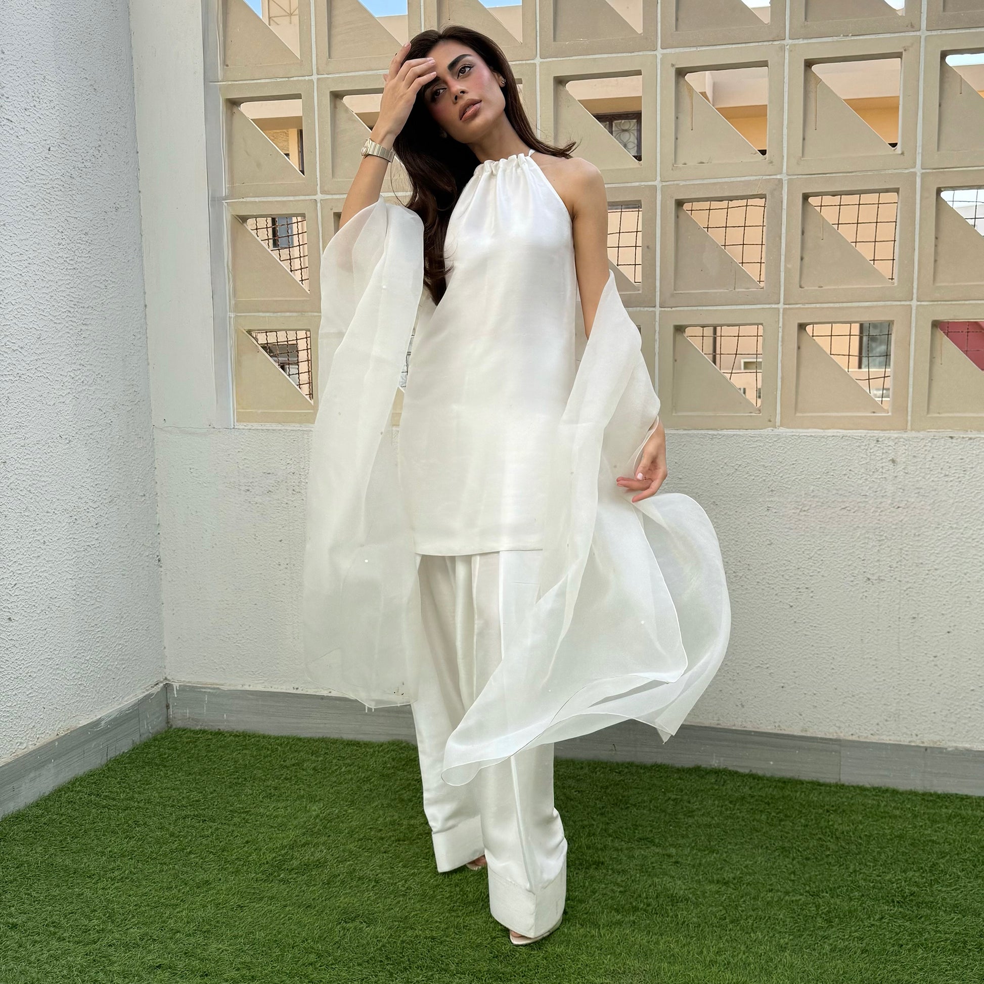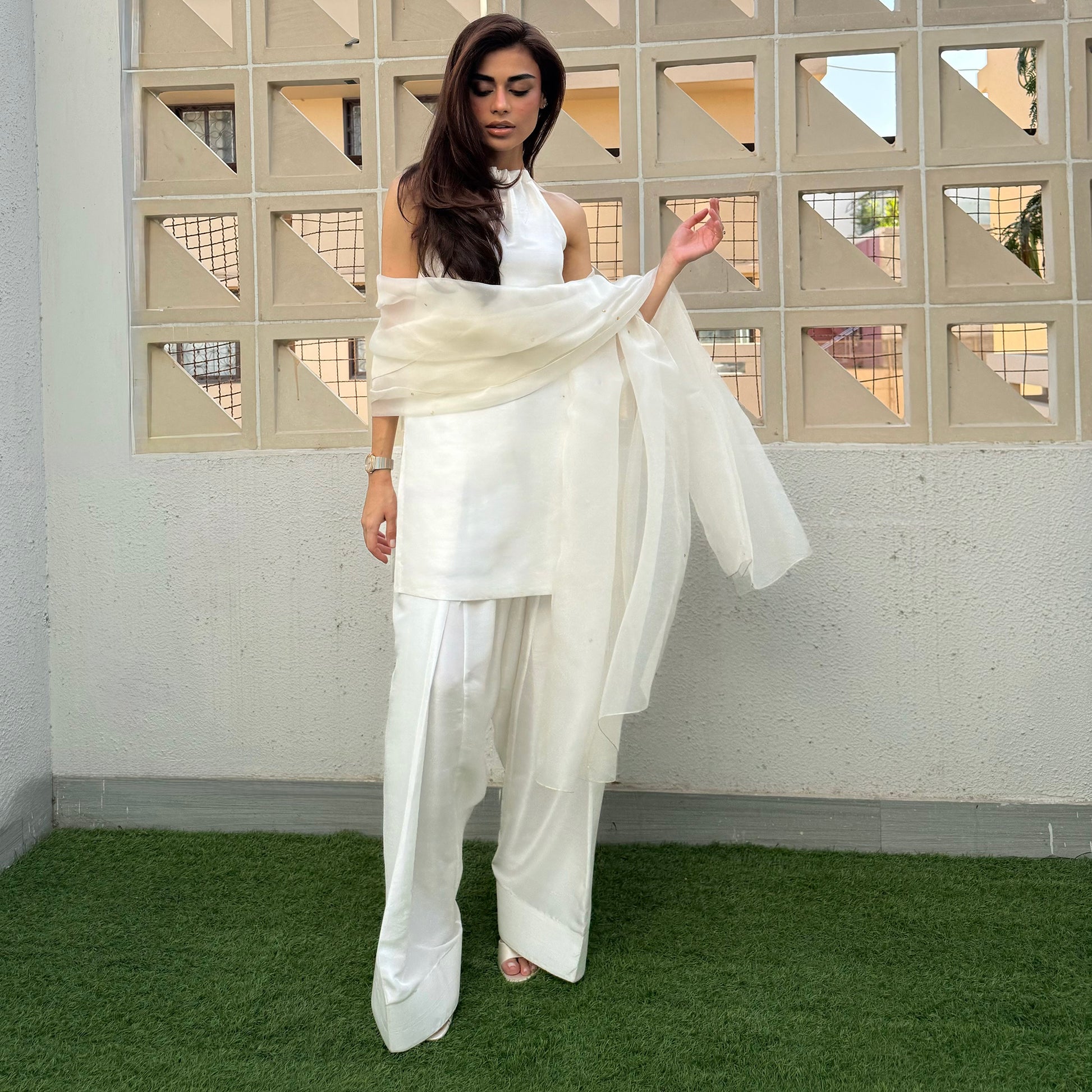 A white outfit that balances structure and volume. The halter-style neckline brings definition to the upper frame, while the farshi shalwar adds movement and tradition. The organza dupatta is styled to frame the look not float.
