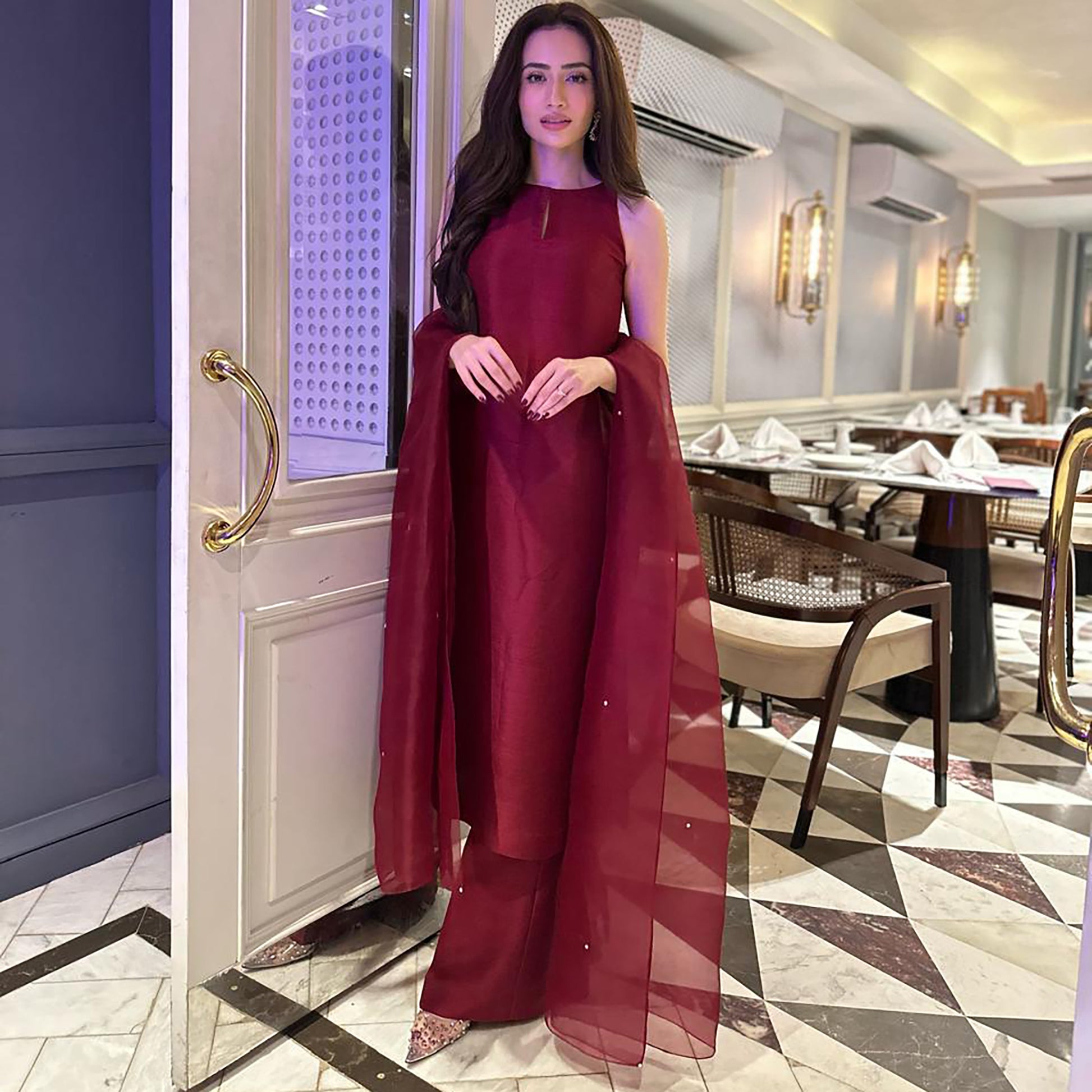 Crafted from pure Raw Silk in a deep maroon tone, this sleeveless ensemble features a distinct teardrop detail at the neckline, adding definition to its clean silhouette. It is paired with wide-legged trousers and a plain Organza dupatta finished with subtle stud detailing.
