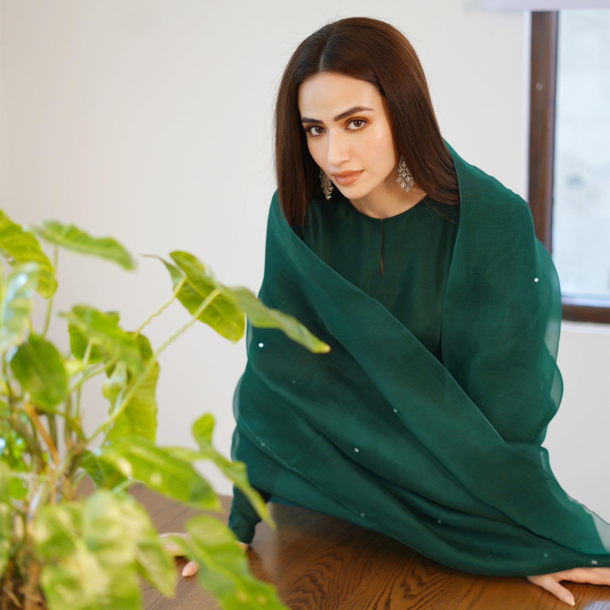 This bottle green raw silk outfit features a chic short shirt and flowing farshi shalwar, blending tradition with modern flair. The rich texture of pure raw silk adds depth and structure, while the plain organza dupatta brings a soft, graceful finish. An effortlessly elegant choice for festive occasions and cultural celebrations.
