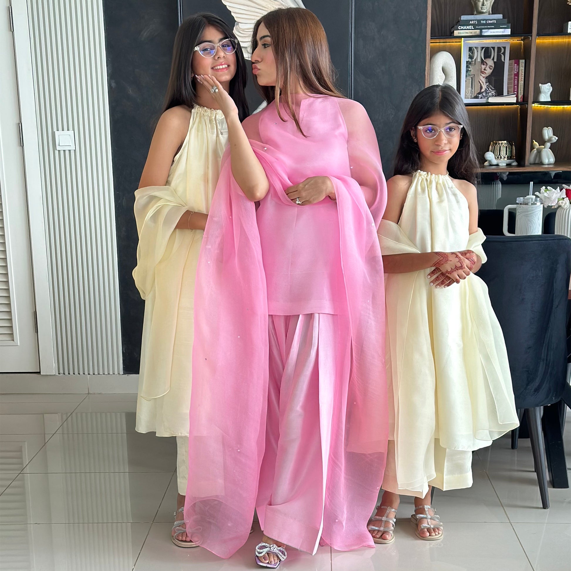 This graceful ensemble showcases a powder pink Farshi Shalwar Kameez, exuding soft elegance and traditional charm. The pure raw silk shirt and trousers offer a refined silhouette, while the simple organza dupatta adds a hint of airy sophistication. A timeless choice for intimate celebrations and elegant daytime affairs.
